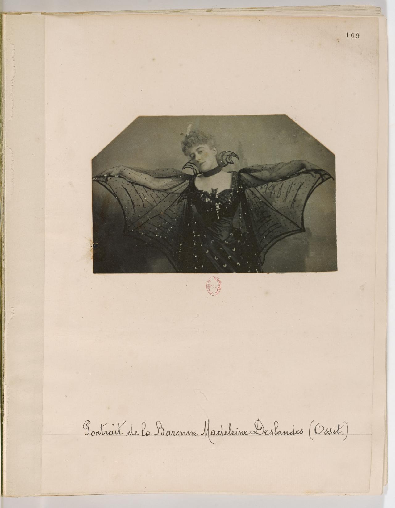 Photography was another medium Deslandes employed in order to shape her self-image. For instance, she appears in a collection of photographs acquired by the famous fin-de-siècle writer and aesthete Count Robert de Montesquiou.27 These photographs are held in the Bibliothèque Nationale, France. See Saunier, pp. 57, 69. In one distinctive example (fig. 7), Deslandes is shown dressed in an eccentric costume with flowing material resembling the wings of a bat, which she displays with her outstretched arms as she tilts her head to one side, while her raised eyebrow assertively engages the viewer. A hairpiece in the style of a winged creature appears perched atop her curls, while a frilled collar, held in place by a black band, circles the back of her neck. In a further enhancement to the theme, there seems to be a bat-like silhouette attached to the bust of her tight bodice. Montesquiou may have suggested the bat motif for this image, as it inspired both the decor of his apartment on the Quai d’Orsay and the title of his book of poetry, Les chauvesouris (1892).28 See Janis Bergman-Carton, ‘“A vision of a stained glass Sarah”: Bernhardt and the decorative arts’, in Carol Ockman et al., Sarah Bernhardt: The Art of High Drama, Jewish Museum and Yale University Press, New Haven and London, 2005, pp. 200–1, n. 19. By means of costume, accessories and her dramatic pose, this staged photograph presents Deslandes as a decided individual who is confident, stylish and creative.