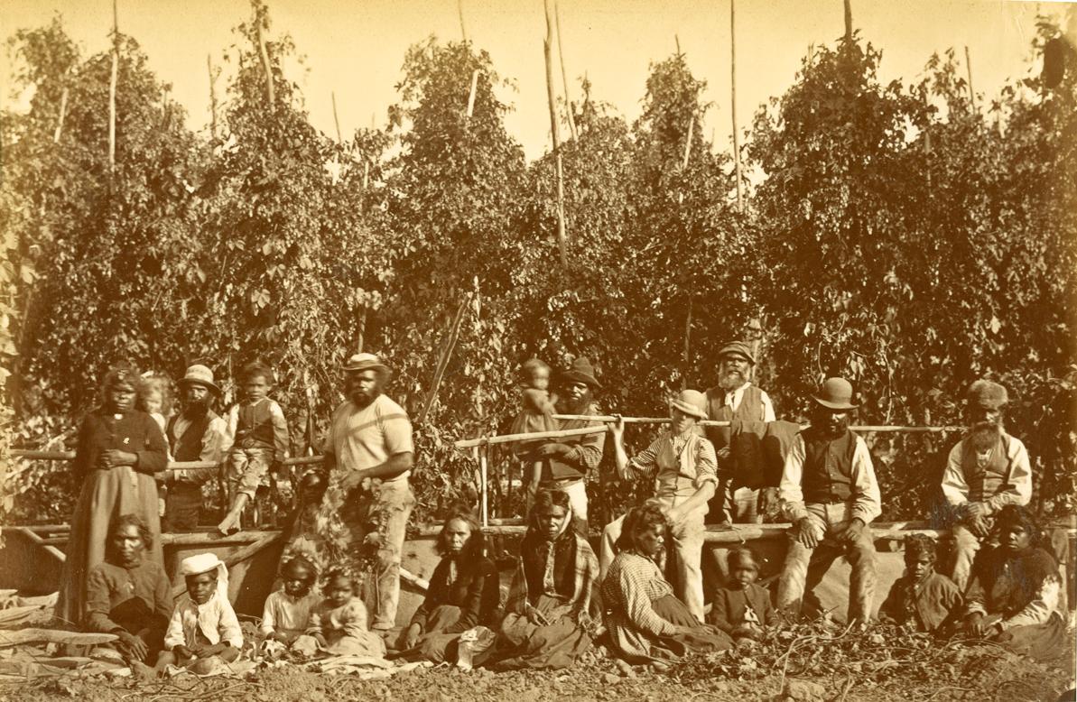 From around 1860 the Indigenous population of Victoria was confined to six reserves where they were expected to live settled, industrious lives in Christian farming villages. Appreciation of the harmonious, yeoman lifestyle of the reserves became a prominent theme in travellers’ accounts, combining the European agrarian ideal with traditional Aboriginal skills such as fishing. Such representations, involving above all a closeness to nature, assumed the form of an idyll, a charming scene of rural peace.8 For a detailed analysis of this visual discourse and Kruger’s work at Coranderrk, see J. Lydon, Eye Contact: Photographing Indigenous Australians, Durham, 2005. Many visitors to the Gippsland Lakes were delighted by the comfort and order of the Indigenous village and especially by its beautiful natural setting. Once hop-picking was introduced to the reserves in 1872, the Aboriginal workers were seen to add an extra note of pleasing exoticism to the scene.9 Illustrated Australian News, 8 August 1872, pp. 201–2.