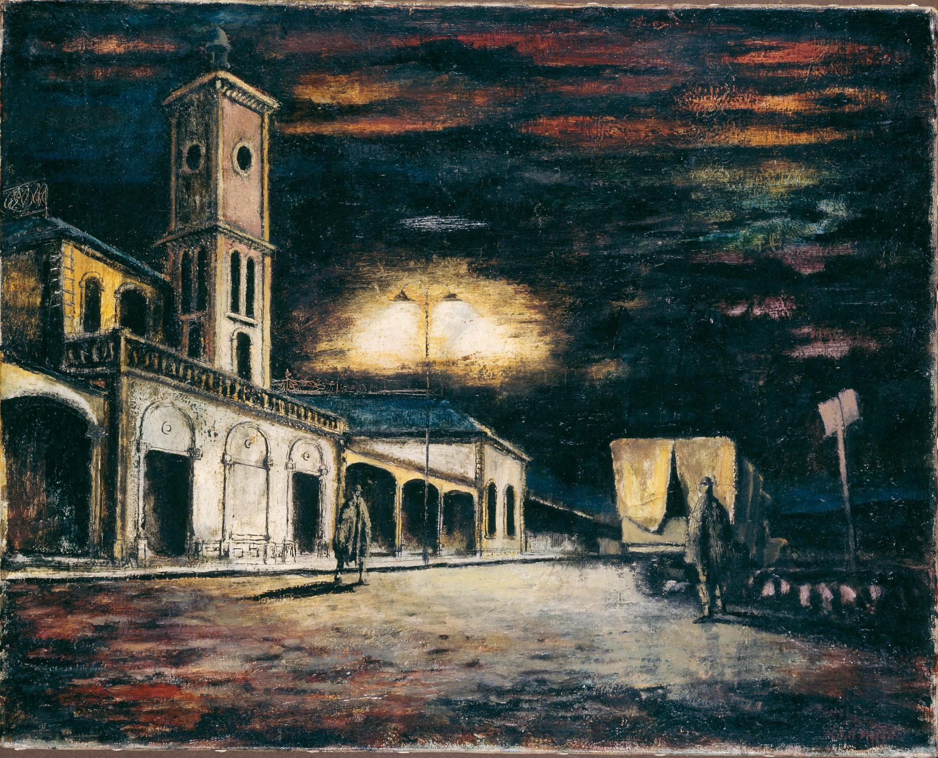 The tedium of war is perhaps most fully examined in the paintings and drawings made by Russell Drysdale between 1941 and 1944 during the Second World War. Rejected for military service due to defective eyesight, Drysdale was nonetheless able to observe army life while living on his property near Albury, New South Wales. The station yard, 1943, depicts two soldiers in front of the Albury railway station at night. While Albury station was vitally important in the movement of troops and goods within Australia, Drysdale chose an unremarkable moment to convey a sense of loneliness and isolation.