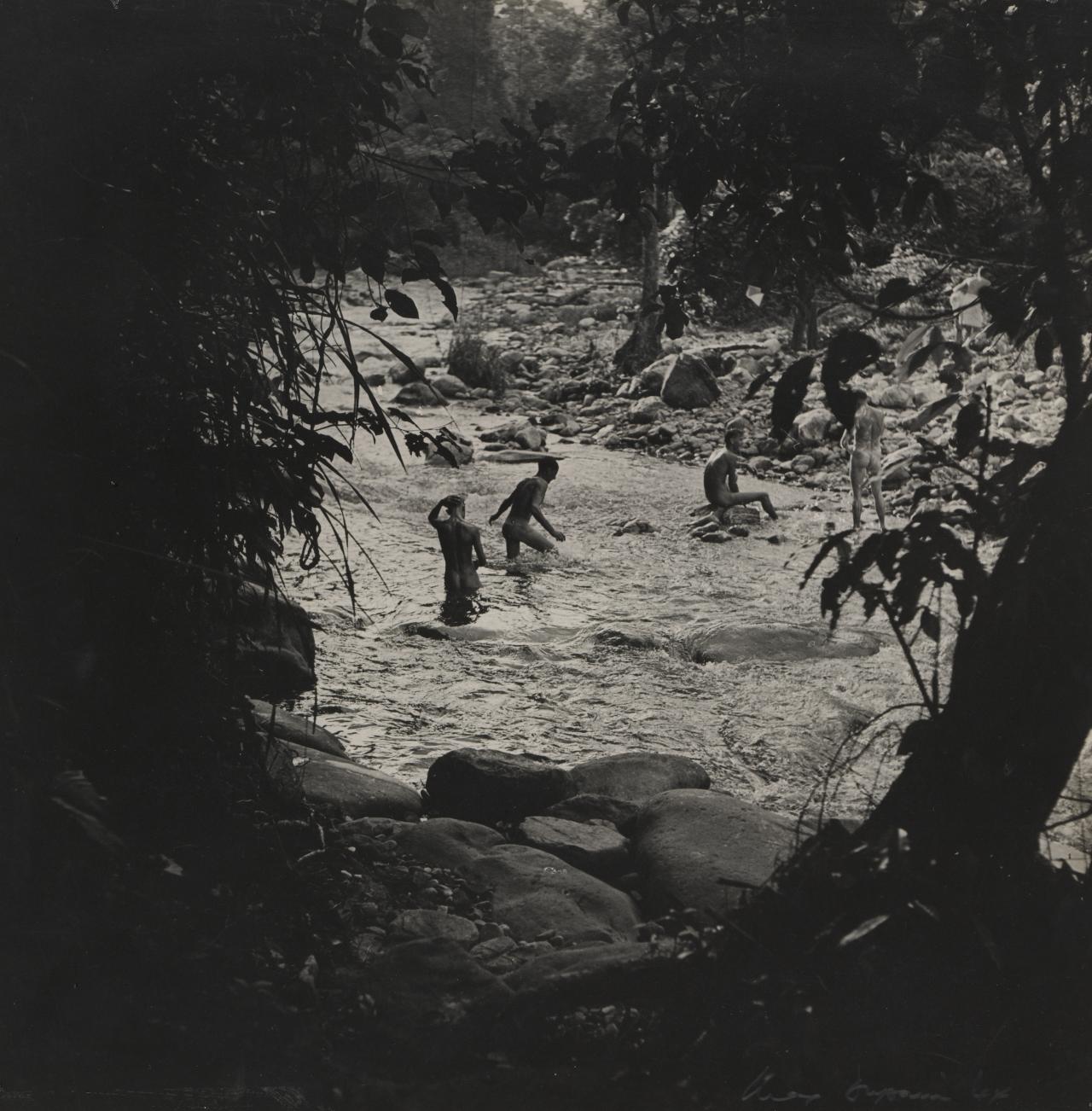 Photographer Max Dupain’s joyous Boys bathing, Goodenough Island, 1944, captures a group of naked soldiers in a moment of light-hearted enjoyment behind the battle lines. Dupain casts these young men as ideals of manhood, harking back to the ANZAC myth and echoing his prewar images of bathers, themselves so important to the construction of an ideal ‘Australian’ body in the 1930s.1See Isobel Crombie, Body Culture: Max Dupain, Photography and Australian Culture, 1919–1939, Peleus Press and National Gallery of Victoria, Melbourne, 2002, pp. 85–97.