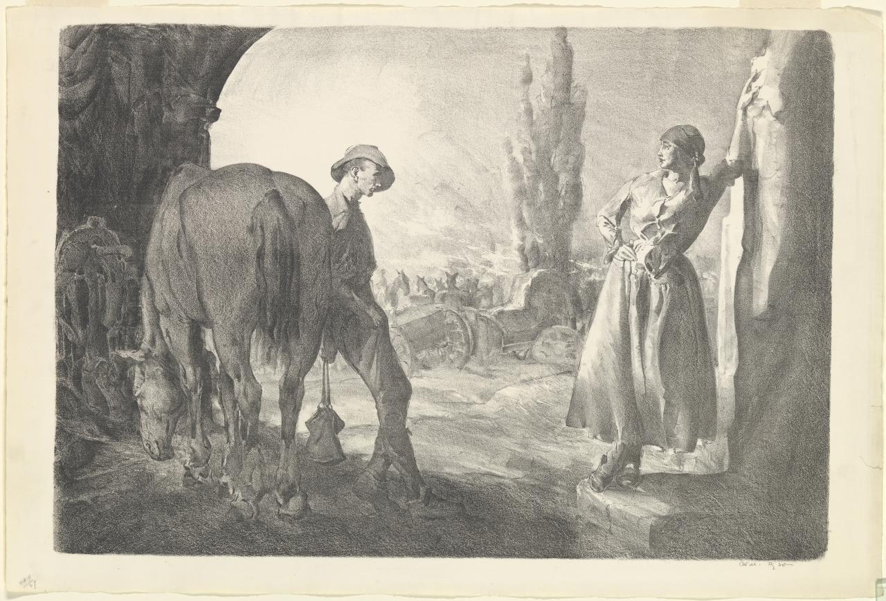 During the First World War the government established the official war art scheme to create a record of the war in art. Will Dyson, the internationally renowned political satirist and cartoonist, was the first Australian official war artist to be appointed, taking up his commission in December 1916. Over the next two years he completed hundreds of drawings depicting the day-to-day hardships suffered by Australian diggers on the Western Front. Compensation (Back at the wagon lines), 1918, is an unusual image within his oeuvre and, indeed, among the works of the First World War official artists. It shows an Australian soldier talking to a young local woman and we are left to wonder about the nature of the ‘compensation’ invoked in the title of the work. Sexual encounters between soldiers and the local population were strongly opposed by military authorities, as venereal disease among the Australians – of which there was a high incidence – rendered them unfit for active duty.