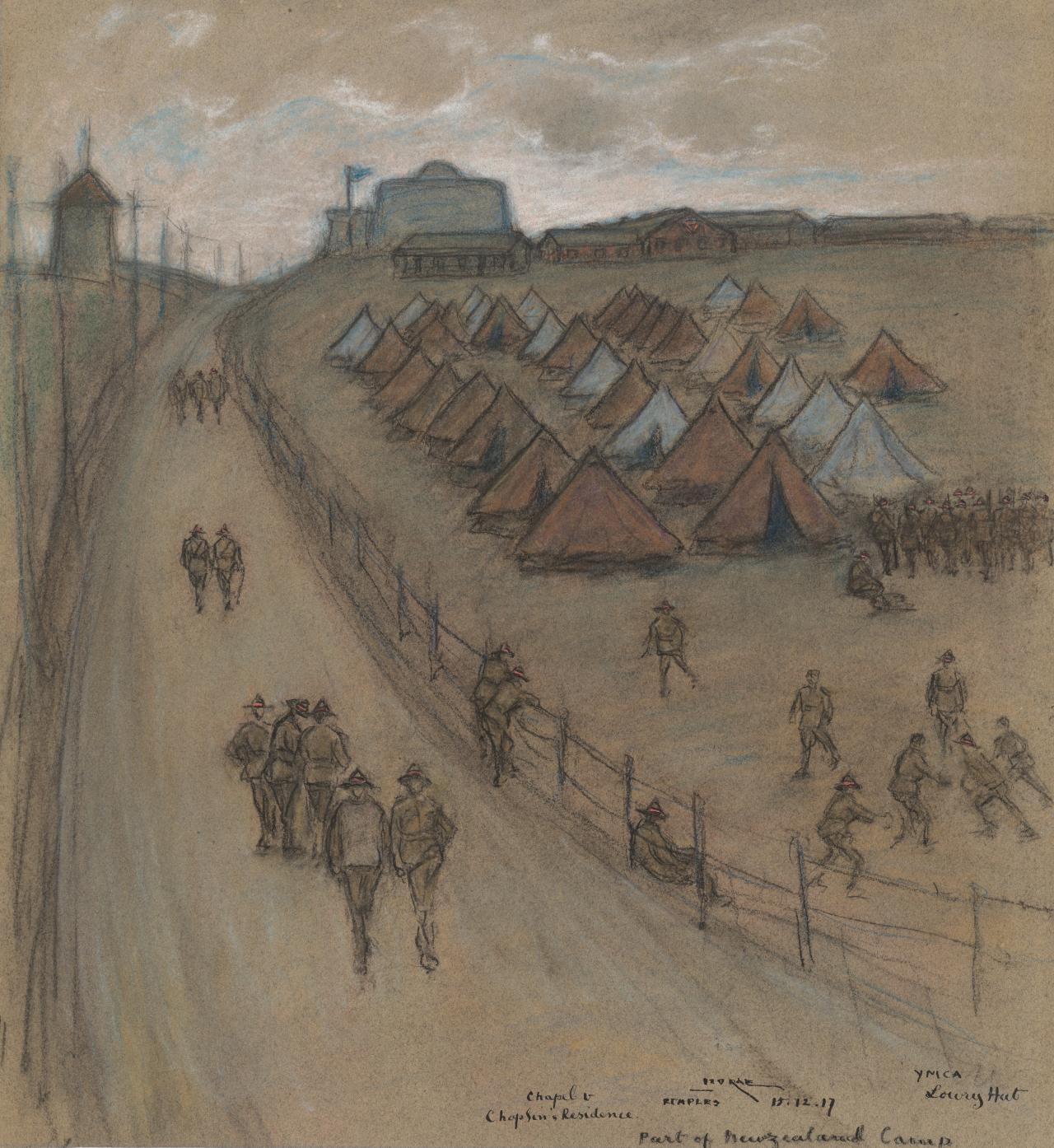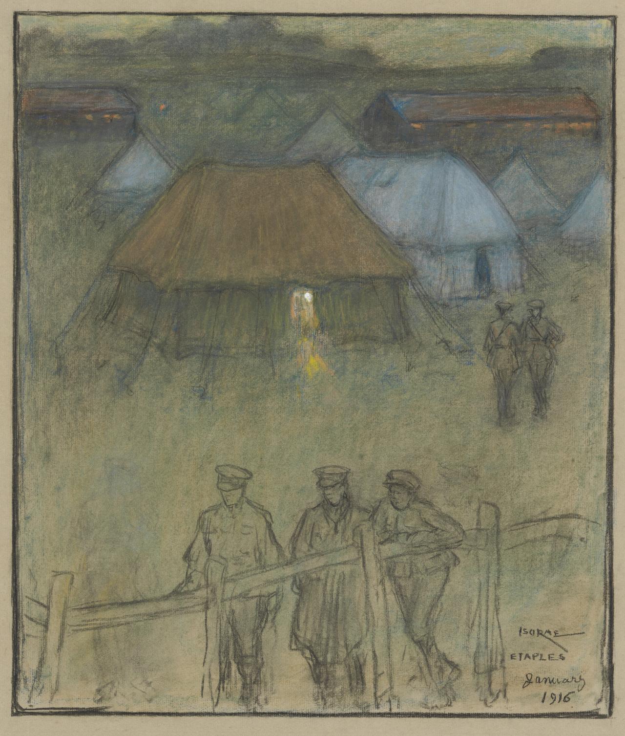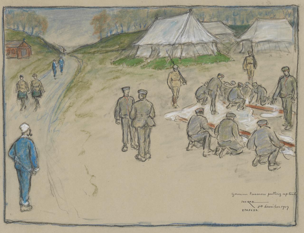 While the only official role for women within the military during the First World War was limited to nursing, many joined voluntary organisations to support the war effort. One such woman was the artist Iso Rae, who made an extraordinary record of life behind the lines while working as a volunteer with the British Red Cross in France.2See Betty Snowden, ‘Iso Rae in Étaples: another perspective of war’, Wartime, no. 8, 1999, pp. 36–41. A long-term expatriate, Rae had left Australia in 1887 bound for further studies in Paris before eventually moving permanently to the coastal town of Étaples on the English Channel. During the First World War, Étaples Army Base Camp was the largest staging camp for Allied troops in France, serving as a transit centre for troops and supplies bound for the Western Front as well as the main Allied hospital base in France. Over 100,000 troops could be stationed there and the multiple hospitals could house up to 22,000 patients. Unlike many expatriates, Rae remained in France for the duration of the war, and worked for the Voluntary Aid Detachment of the British Red Cross in one of the YMCA huts in the camp. Her hundreds of pastel drawings record daily life in the camp, from football games and the cinema to the troops training and the German prisoners who were interned there, as shown in works German prisoners putting up tents, 1917; Étaples, 1917; and Part of New Zealand camp, 1917. Created solely for her own interest, Rae was one of very few female artists to depict life behind the lines during the First World War.