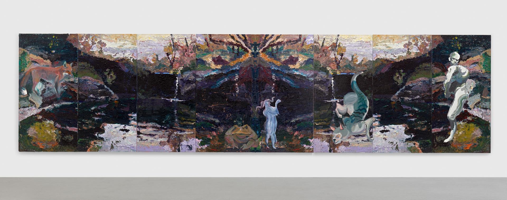 150 year, Rorschach, 2019, is a seven-panel panoramic landscape painting by leading Australian artist Ben Quilty and generously gifted through the Felton Bequest. The third work by Quilty to enter the NGV Collection, it is one of his largest and most ambitious paintings created to date, depicting a landscape familiar to Quilty and his son from regular bushwalks in the NSW Southern Highlands. It is structured to resemble a Rorschach psychological test, designed to tease out the unconscious thoughts of a subject, who provides free-form associations in response to amorphous visual forms.