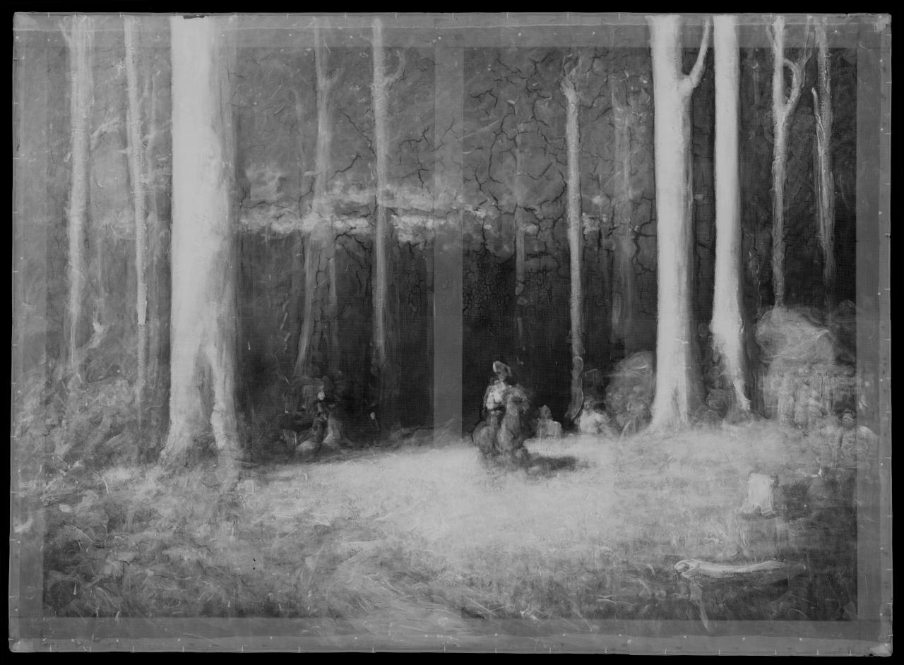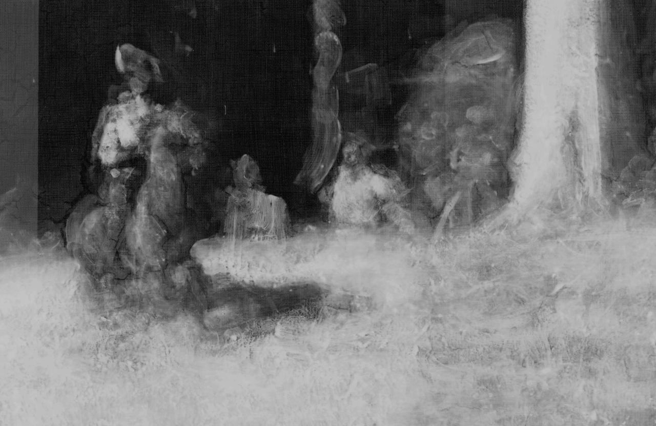 The X-ray suggests that the trees were originally painted using a lead rich paint and were therefore light-coloured. Most were later suppressed, either through tonal darkening or shrouding with smoke, leaving only the three luminous central trees. This minor but important adjustment helps eliminate distractions at the edge of the frame, increasing the dramatic impact of the poignant figure of the central horseman, spotlighted by the embers as if he has just emerged onto an eerie stage.