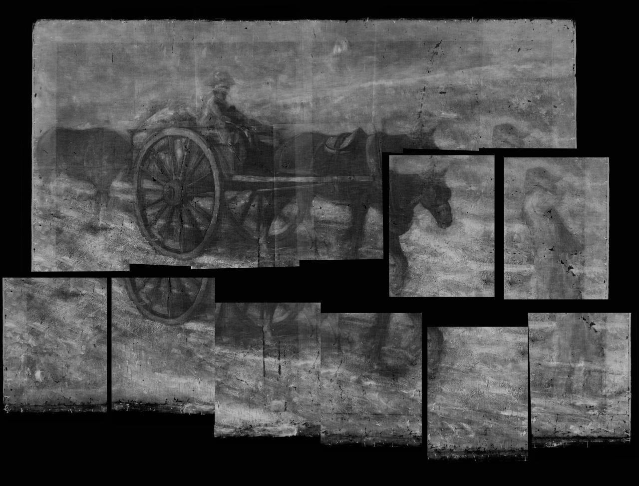 Consistent with the revised narrative, McCubbin made several other changes that can be seen in the X-ray. A second horse was originally present at the far left but was later painted out, presumably to emphasise the isolation and poverty of the struggling family. The head of the main horse, which was originally painted in a more raised and alert position, was also lowered and the distance between the two hind legs increased, accentuating the sense of fatigue and faltering in the extreme heat. We can render these adjustments more visible by creating a semi-transparent digital overlay of the painting and X-radiograph.