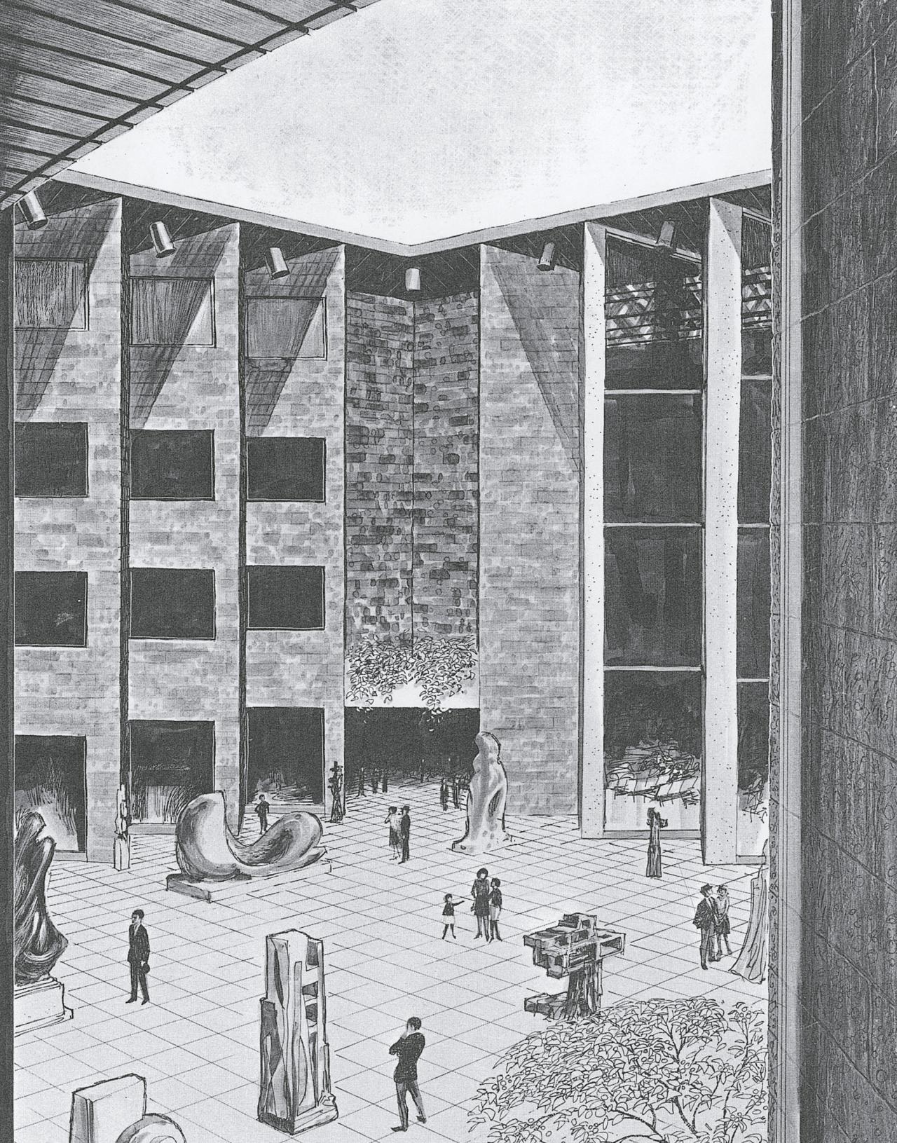Having dispensed with the possibility of situating the Draped seated woman externally, there was really only one alternative left to Grounds and Westbrook. Although not widespread in newly designed art museums by that date, the concept of a central sculpture gallery or open-air sculpture courtyard had, nonetheless, centuries of museological tradition to support it. A sculpture courtyard had formed the centrepiece to one of the world’s first museums, the Vatican Belvedere created by Pope Julius II in the early sixteenth century, and many major galleries still also retained centrally situated, dedicated sculpture galleries at the heart of their visitor circulation routes. Both the Tate Gallery in London, for example, and the National Gallery in Washington, followed these lines. The option of creating a central sculpture gallery — left open to the sky to preserve the outdoors setting required of the Draped seated woman — must have seemed to offer the best of both worlds in that it allowed Moore’s work to be viewed in an outdoor setting while at the same time providing obvious security advantages and allowing Moore’s work to be compared with other similar sculptures displayed alongside.