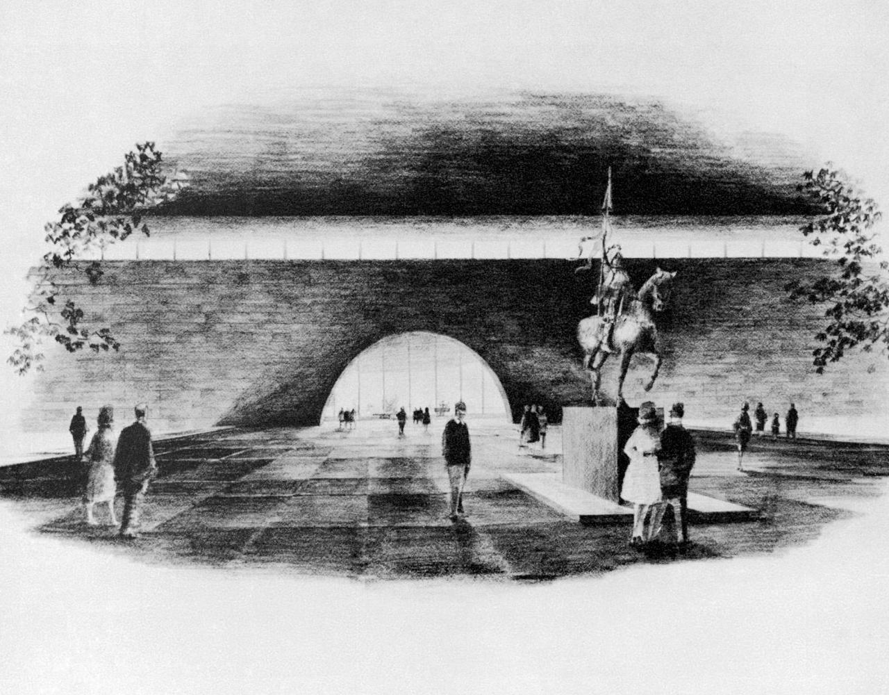 Westbrook’s letter to Moore introduces another key motivation underlying the acquisition that would soon prove more troublesome for the NGV to realise. Besides acting as a ‘destination artwork’ denoting the new NGV’s sophistication and international modernity, Westbrook and his colleagues evidently also wanted Moore’s Draped seated woman to form the centrepiece of a new collections policy aimed at building up a prominent collection of contemporary Australian and international sculpture. This need for the Draped seated woman to be related to a wider projected installation of work soon led to Grounds’s and Westbrook’s decision not to place it in the forecourt of the new building, as one might have otherwise expected. This was confirmed by the time of Grounds’s first presentation designs for the new building produced in late 1960 (fig. 4). These had been drawn up following the semi-legendary overseas trip in mid 1960 undertaken by Grounds and Westbrook to inspect international contemporary museum trends, a trip which had begun, ironically enough, just two days prior to the arrival in Melbourne of the Draped seated woman (the reason, incidentally, why Westbrook played no role in the early public announcements).26 Goad, 1993, p. 76. In his first presentation drawing of the entrance to the new building, Grounds somewhat incongruously attempted to accommodate Frémiet’s Joan of Arc by placing it at the forecourt as if ‘exiting from a castle’ as a recent commentator has put it.27 ibid., p. 79. This idea was evidently soon dropped, however, so that Joan of Arc never did leave her commanding position on Swanston Street. But this then created a vacuum for the installation of an appropriately modern counterpart to Frémiet and Boehm outside the new NGV that would take many years to be satisfactorily realised and to which Westbrook himself would also turn, unsuccessfully as it would transpire, within the space of a few short years.