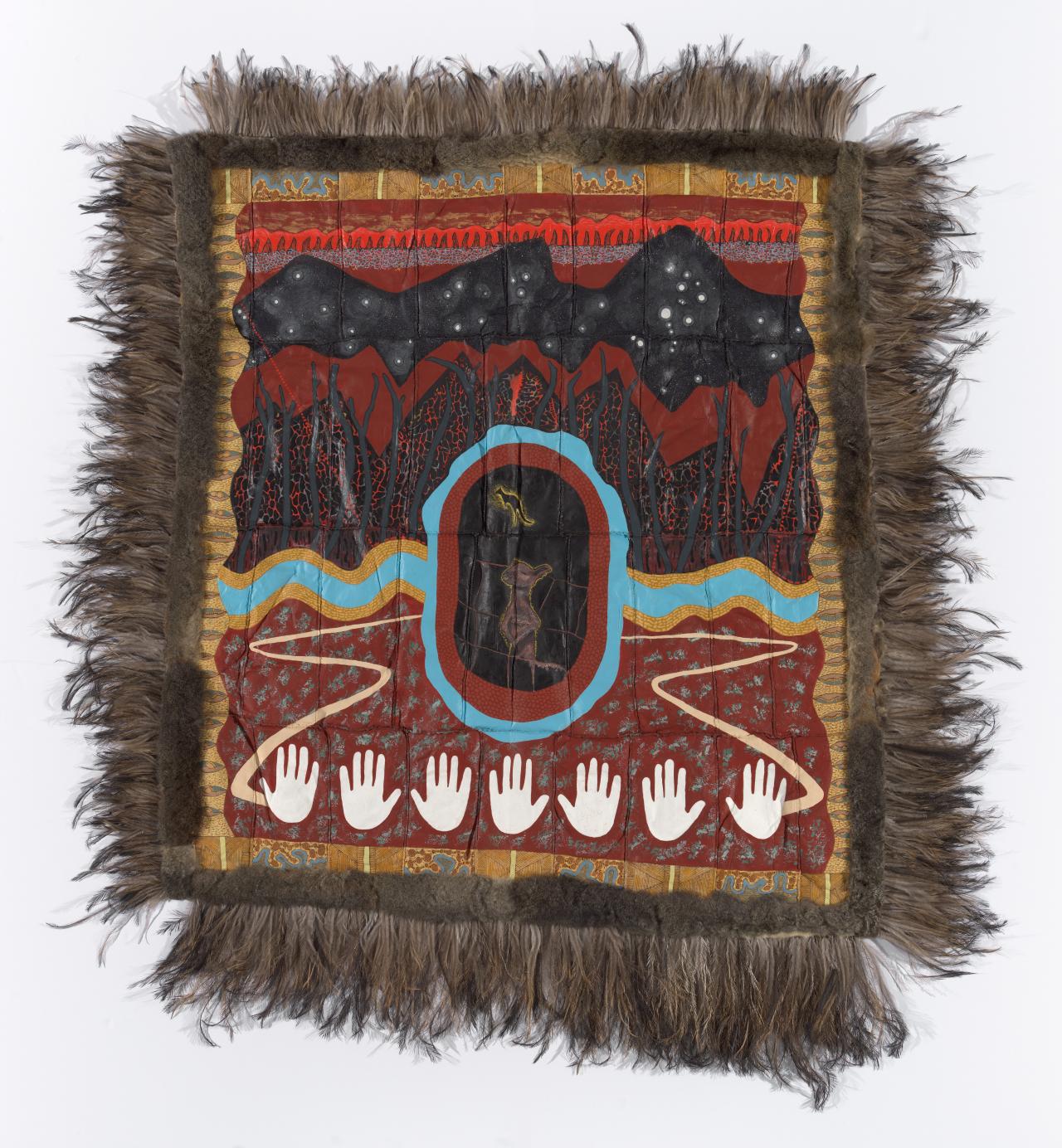 In the summer of 2019–20, the south-east of the country was ravaged by devastating fires. As a response to this catastrophic fire event, Yorta Yorta artist Treahna Hamm created a possum skin cloak in two parts. The first cloak titled Eye of the storm, 2020, references the horrific images we witnessed during this time; in particular, a photograph of a deceased young kangaroo who was caught and trapped in a wire fence. Hamm memorialises the kangaroo, placing it at the centre of the cloak, and in turn pays her respects to the nearly three billion animals, birds, insects and fish who lost their lives to the fires. The second cloak titled Dark Emu spiritual cultural connections to Homelands, 2020, provides hope for the future. Inspired by the book Dark Emu by author Bruce Pascoe, Hamm makes connections with the ancient landscape, the rivers that flow through her Country and the history of connection that carries on through her bloodline.