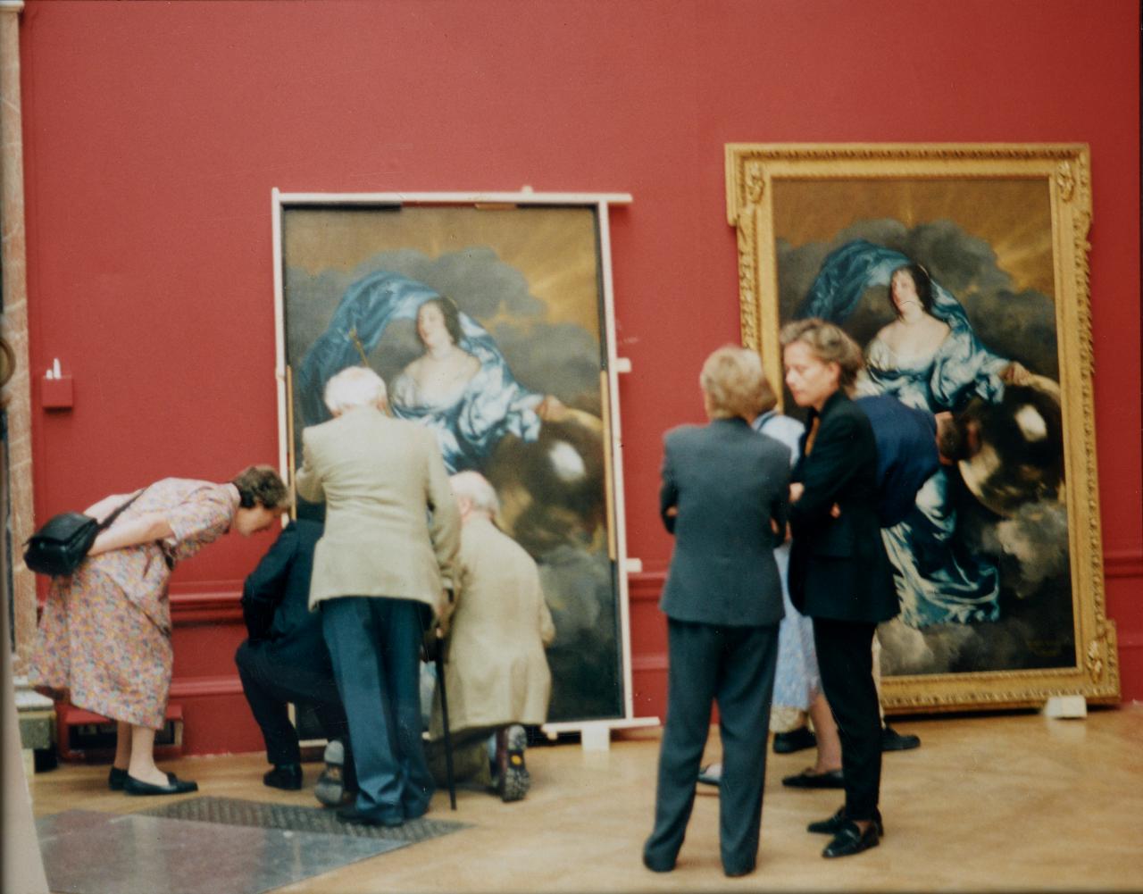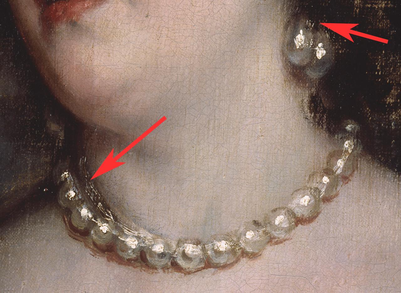 Jabach’s description about how van Dyck’s paintings were constructed played a role in resolving the debate about which of the two portraits was the primary version. A number of important details in the execution of the head were revealed in 1998 when old restorer’s retouchings were removed. They showed a distinct line of separation between the head and the rest of her upper body that had been masked by the pearl necklace. Moreover, van Dyck had daubed small white sketch marks to locate the positioning of Rachel’s necklace, teardrop earrings and hair-restraint. All of these preparatory details are signs that the portrait was painted directly from life. Marks like these are rarely if ever found on replicas because the whole image can be transcribed seamlessly without having to be first marked out in this relatively crude way. These preparatory markings were not present in the Fitzwilliam version. In 1999, the two paintings were brought together in London for the first time in over 350 years for a private viewing before a large group of British art scholars. The matter was resolved with the consensus that the Melbourne portrait was the primary version.
