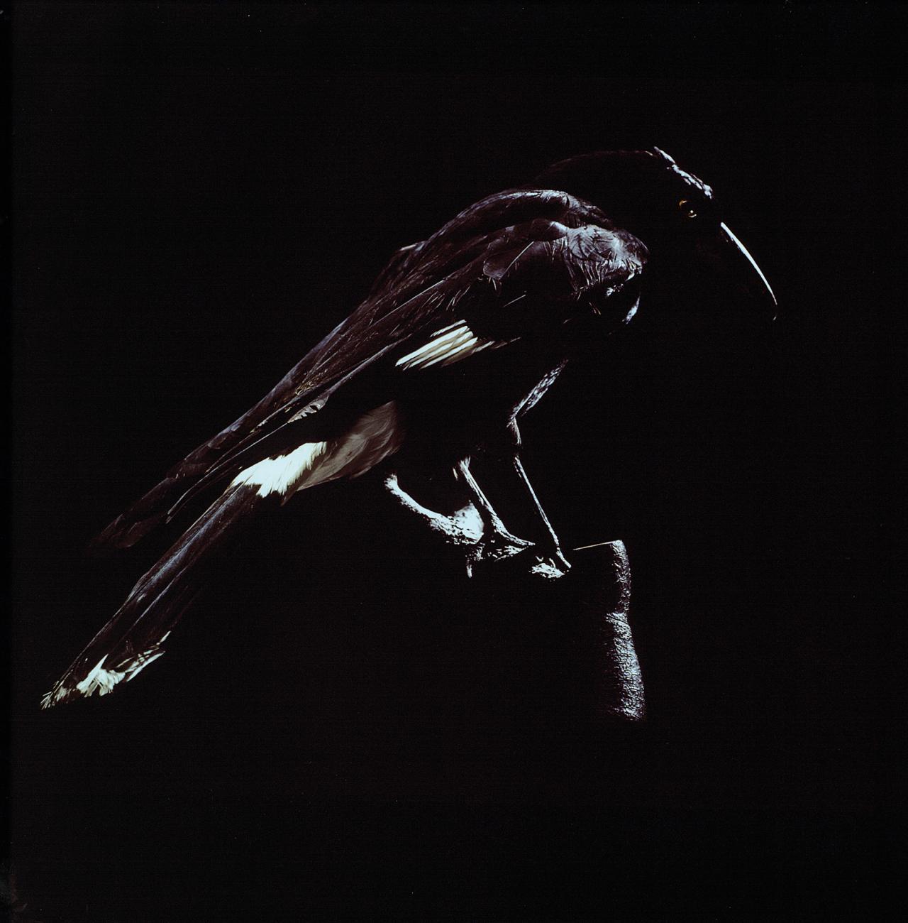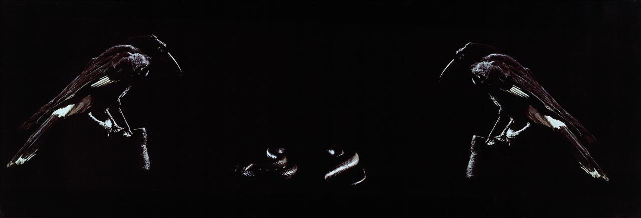 In Tensio (currawongs and snake) (fig. 2), also part of the same suite, the image of two currawongs, each looking at a coiled snake, continues the theme of the mirror image, of reflection and imitation. Again, the taxidermist’s objects have been removed from a museum and staged in Andrew’s black space. In Aboriginal mythology the crow is often depicted as an antisocial creature that never shares the company of other birds. Therefore it is black, completely black, whereas other birds have colour and variety. When colour spread throughout the bird world, black birds ignored their fellow birds and missed out, remaining black, like the inchoate world from which life sprang.