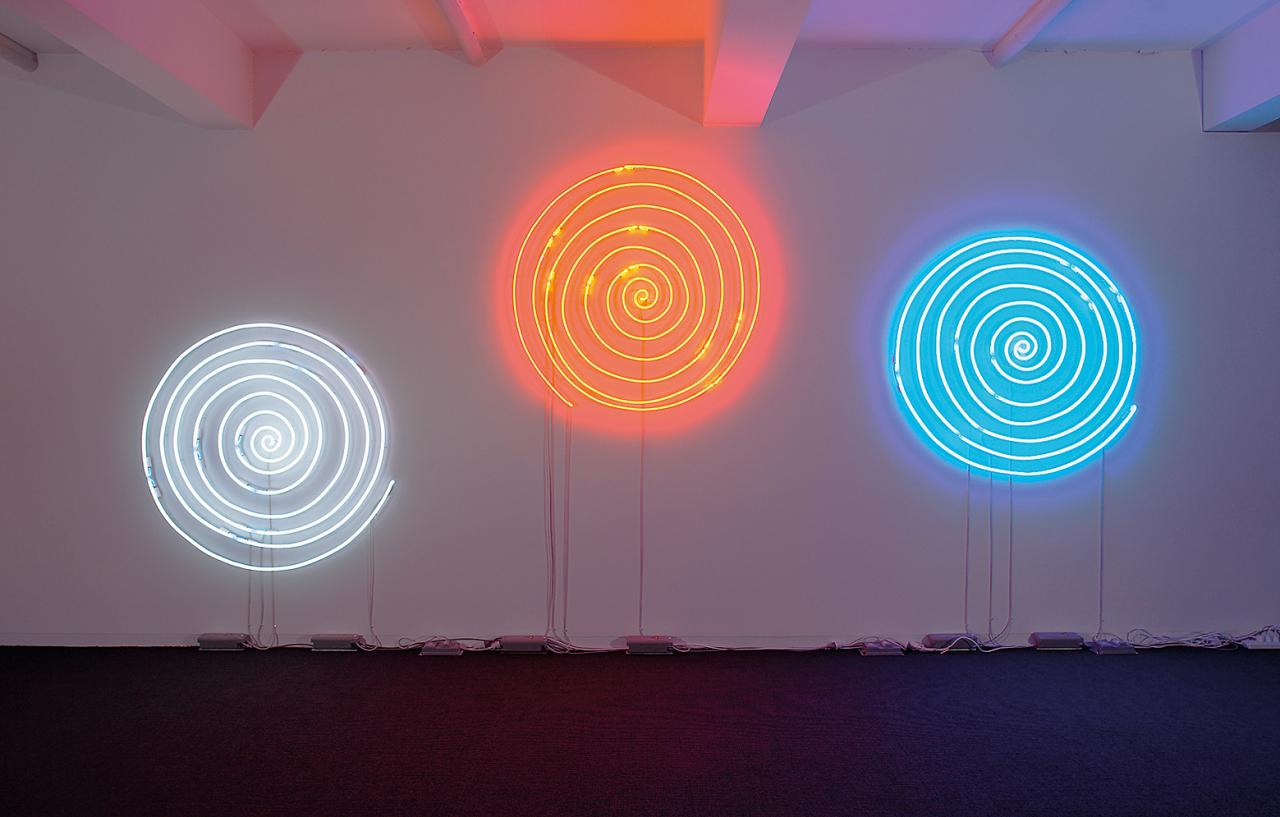 The Gun-metal Grey works develop these ideas with none of the studied irony and energy of his Peace, The Man & Hope, 2005, from his Hope & Peace series of screenprints. The gravitas of the works is striking. The neon lights in red, blue and white are not playful but political; we are looking at what was there at different moments on the frontier when the Empire sought to conquer Terra Australis, the Great South Land – several distinctive people, caught in several moments: fornicating, afraid, looking at the camera, trees in the background, the earth. Here, death and the past are embodied in the artist’s grasp of his responsibility to converse with the subjects as a presence not an absence. Here, art is philosophy, drawing us into the problem of what we ‘see’, and the resonance of the struggle to unravel self from the other in the history of philosophy is resolved visually. The remarks of Levinas on this mystery are apt: