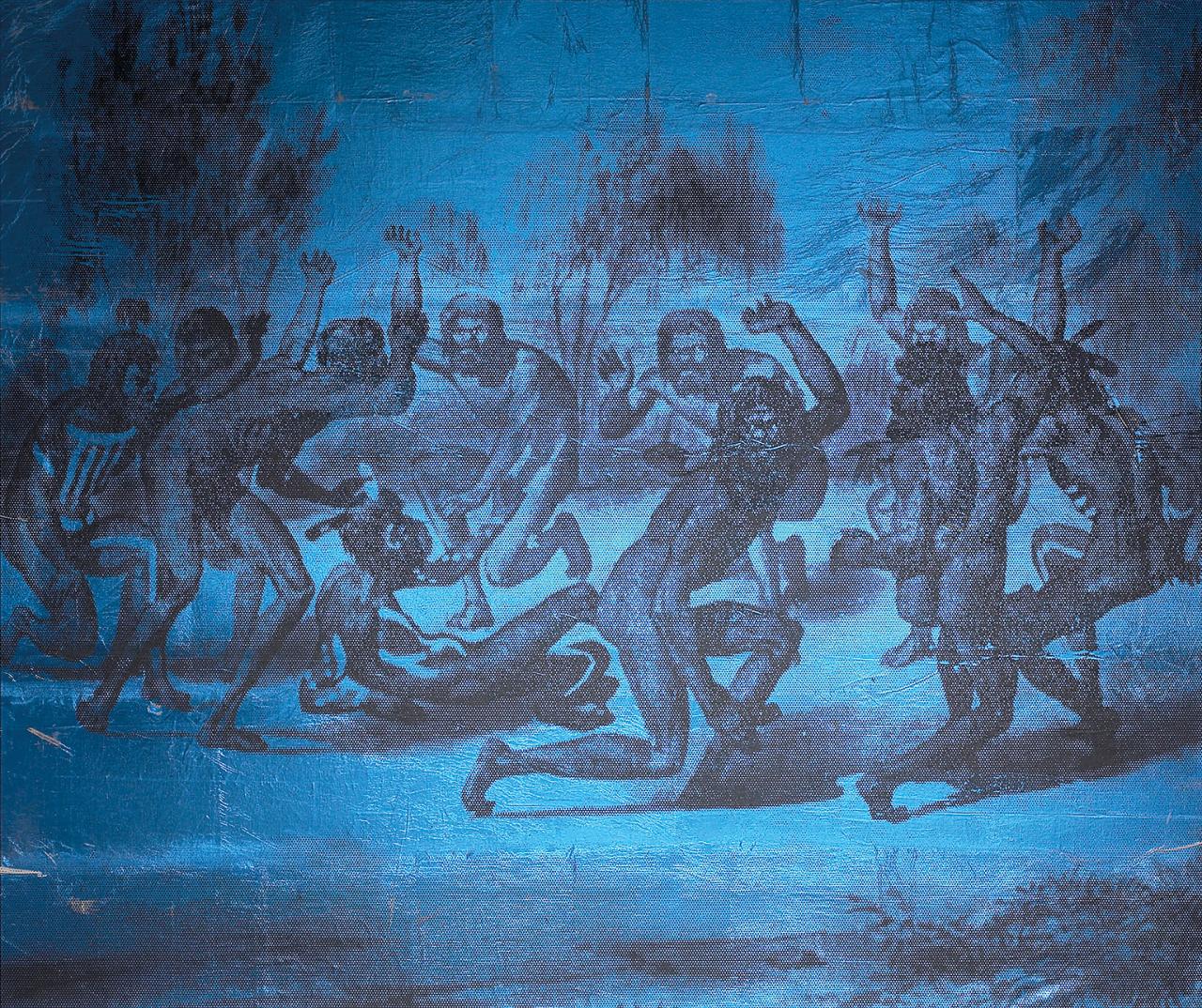 This final ‘provocative’ point is one that Kaplan would like to explore further, for as we should well know, history is not ‘dead’. The past is present and, in this regard, her observations are apt, for it is the achievement of Andrew in his enchantment of the ethnographic photographs used in his oeuvre that interests me here. He manipulates tensions involved in personal and social identities – both modern and historical – and yet while he explores the human predicament of colonialism and after modernism, he ties his insights to place. This is his distinctive contribution as a Wiradjuri man, his emotional bond with his mother’s country always shimmering in the background of the global space of the cosmopolitan citizen freed from tradition. If his art practice and worldly experience have released him from the claustrophobic tropes of the subjugation of the natives in the long ago and recent past, he has also been masterful in capturing that pain and humiliation while liberating their ghosts from the vast collection of images produced in studying and displaying them as trophies of the march of progress. This much is obvious to the informed reader of Aboriginal art images. He targets historical events in two series of new works that mark a rapid maturity from his earlier interest in modernism and Pop art. His recent series of works – Gun-metal Grey and The Island – are at once ethical portraits and gothic ghost-scapes rescued from the anthropological archives. They are more philosophical and moody in their reach into the human depths of suffering, cruelty and the grotesque than his earlier modernist works. With his deft reproduction of alarming historical photographs in innovative use of media and styles, his provocation of our readings of history and tropes, inherited visual cultures and ideas, he leaves little room for escape into arch critical stances that purport to position Andrew rather than ourselves in the stream of art history.