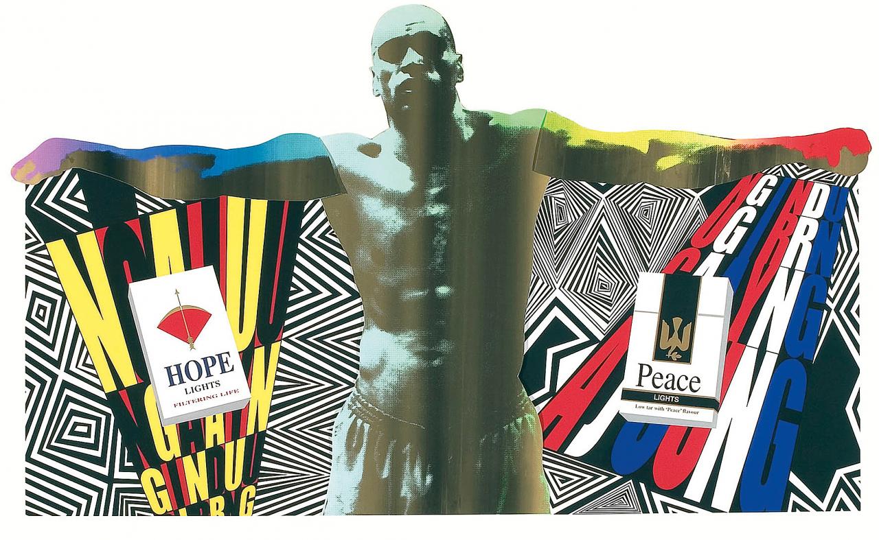 While glamorous, the blak postcolonial man in Peace, The Man & Hope is a compromised and difficult study that bears some explanation here. This suite of works celebrates the postcolonial Aboriginal man as a hero of the resistance. However, all is not what it seems. The use of dollar signs and guns in these screenprint collages from the Hope & Peace series suggest the insinuation of excessive consumerism into the lives of alienated youth, despised racial groups and the victims of globalisation. Andrew hinted at the heavy signification of bling in blak ghettoes everywhere, with Swarovski crystals, diamond dust and graphite. The violent and vain male culture of the gangs and rap music industry of black American life, the bling-bling as male body adornment and other garish items of the cult of conspicuous consumerism of the street life, are the predominant exports to the others of globalisation, resulting in entrapment in a culture of black kitsch that poorly serves the desire for self-esteem of young black men.