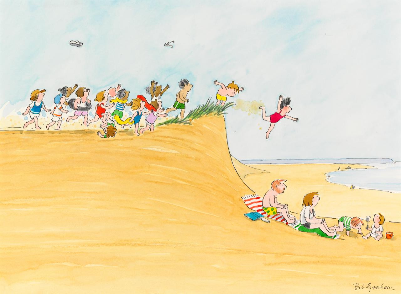Tan, one of a younger generation of illustrators, creates dreamlike scenarios in his complex works. Even when his stories include specific references to Australian landscape and history – such as in The Rabbits (1995) – they operate as universal tales of conflict and dispossession. Arguably, the greatest stories are those that ring true either because they are generally applicable or because they manage to distil the essence of a quintessentially Australian experience, such as Bob Graham’s Greetings from Sandy Beach (1990) which tells the story of a family on a beach holiday that does not go according to plan.