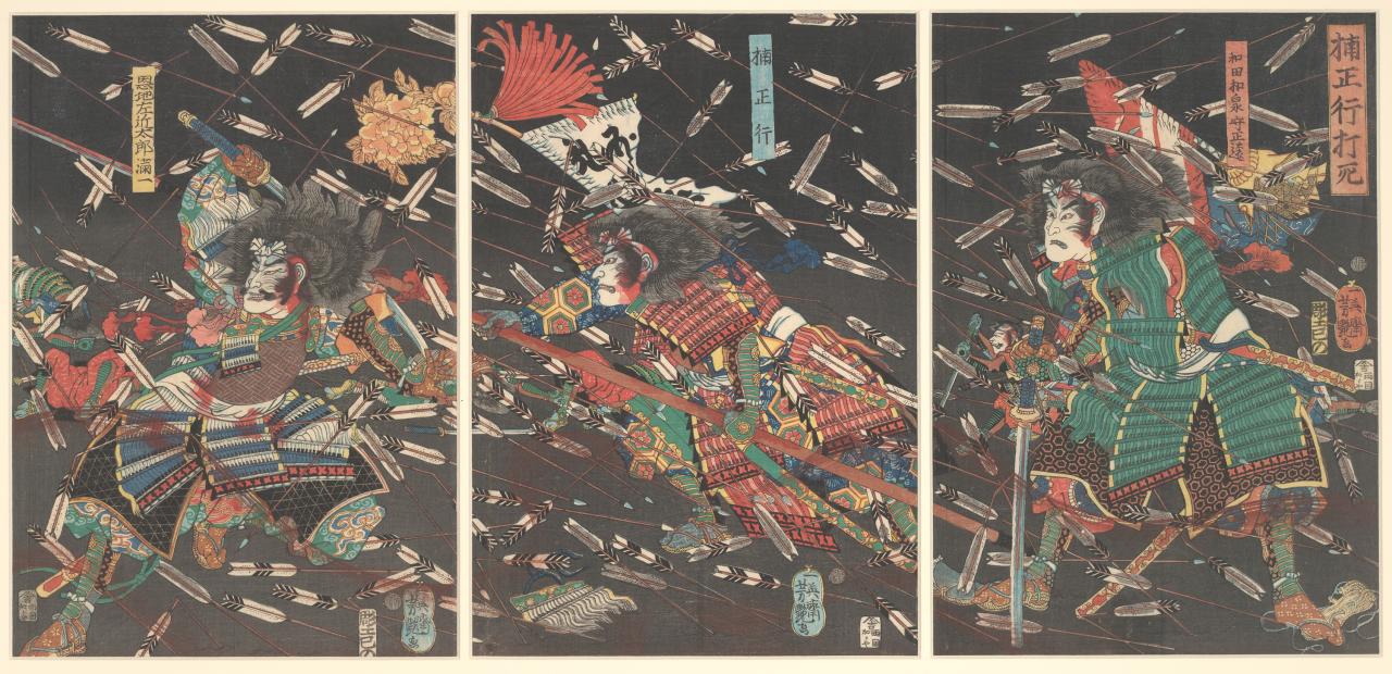 Other episodes from samurai legends are brought to life by colourful and dramatic woodblock prints popular during the closing years of the Edo period and into the early Meiji period. These images of blood and bravery include some of Utagawa Kuniyoshi’s warriors from his series of forty-seven rōnin (masterless samurai), Tsukioka Yoshitoshi’s depictions of samurai battling to preserve the Tokugawa feudal system at the Kumamoto uprising, as well as the suicide of Saigō Takamori (often referred to as the last true samurai). In the adrenaline-filled print The death of Kusunoki Masatsura, 1862, by Utagawa Yoshitsuya, we see the famous fourteenth-century general Kusunoki and two fellow warriors battling through a storm of arrows at the battle of Sakainoura in 1348. In the poetic tradition of many samurai, before his final battle Kusunoki composed the following death poem, which may have influenced Yoshitsuya’s melodramatic work of art: