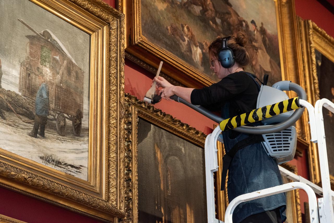 Dust layers are unsightly and can also attract moisture and insects; however, too frequent or vigorous dusting can lead to abrasion of delicate surfaces. The horizontal parts of a frame (top and bottom frame members) tend to collect the most dust. Prior to dusting, inspect surfaces and ornament to ensure they are stable and secure. For gilded surfaces use a large soft-bristled brush to gently flick the dust off the surface into the nozzle of a vacuum cleaner, which as a precaution is to be covered with a mesh in case any fragments become detached. Ensure that the vacuum nozzle or hose does not come into contact with the frame surface.
