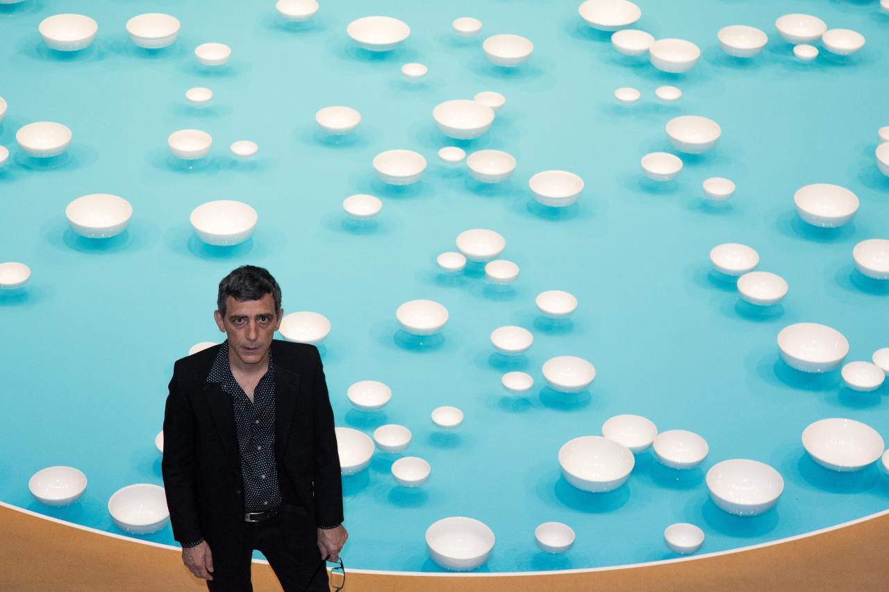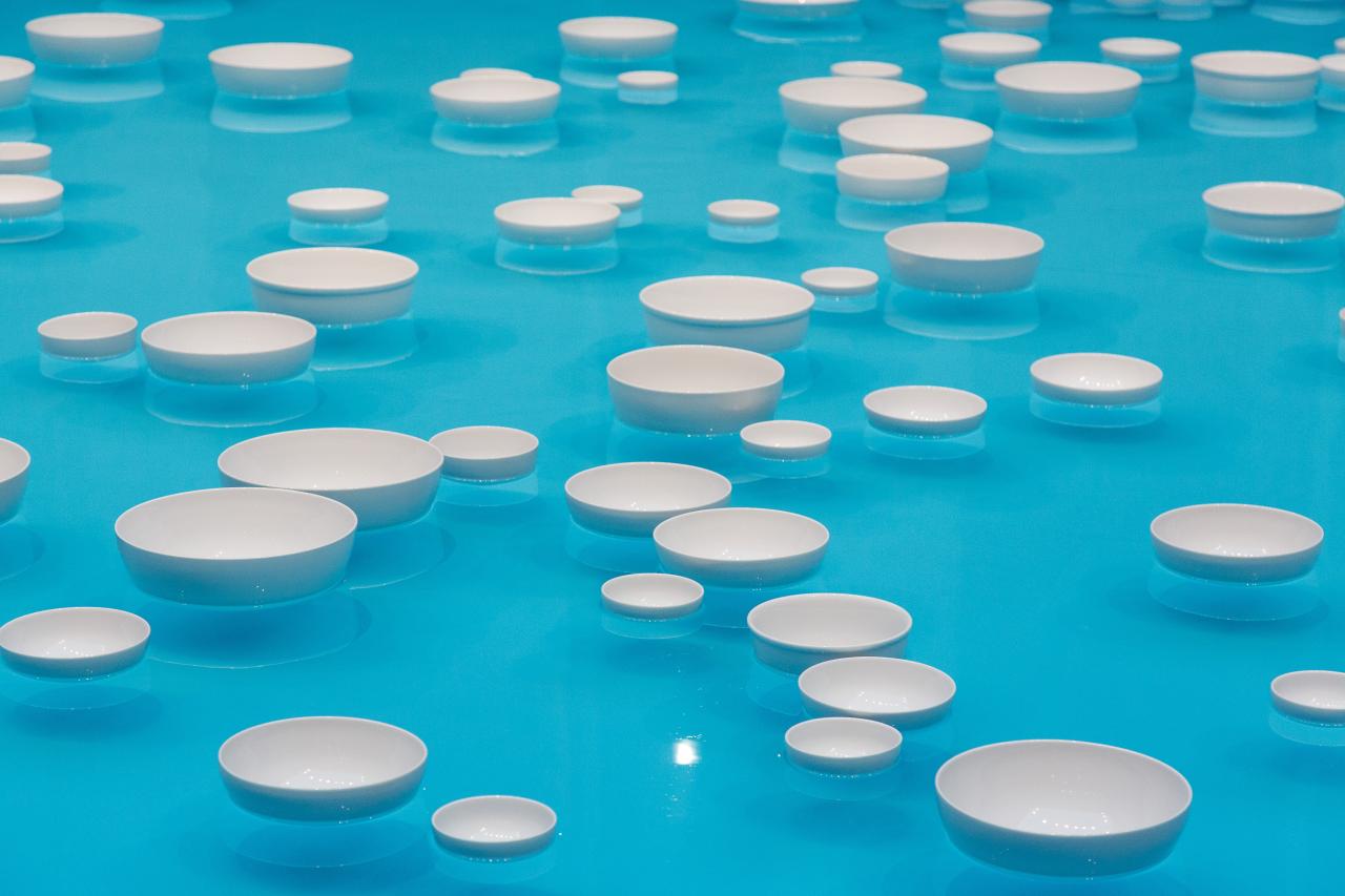 One hundred and more white porcelain bowls float on the surface of an expansive, intensely blue pool. The water is heated to optimise the porcelain’s acoustic resonance. Swept along by submarine currents, the floating crockery circulates gently, colliding as percussive instruments which create a resonant, chiming soundscape.