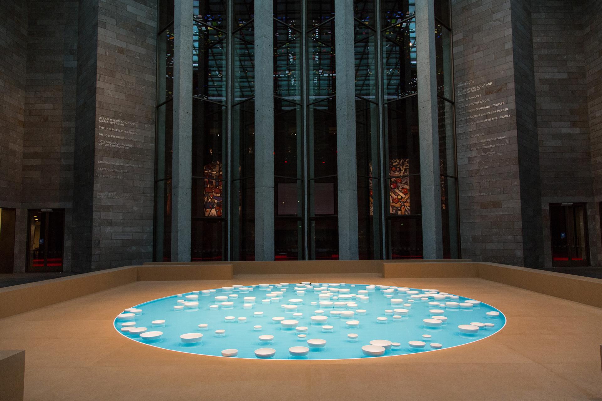 The title of clinamen, 2013, by French artist and composer Céleste Boursier-Mougenot, refers to the curve and swerve of celestial configurations; to the arc of the sun and the unpredictable motion of atoms moving through and colliding in space. This aquatic, acoustic installation set within the forecourt of the National Gallery of Victoria fills the space with colour and sound and creates an uncertain and changing form of chamber music, whose aleatory form is echoed aurally and pictorially.