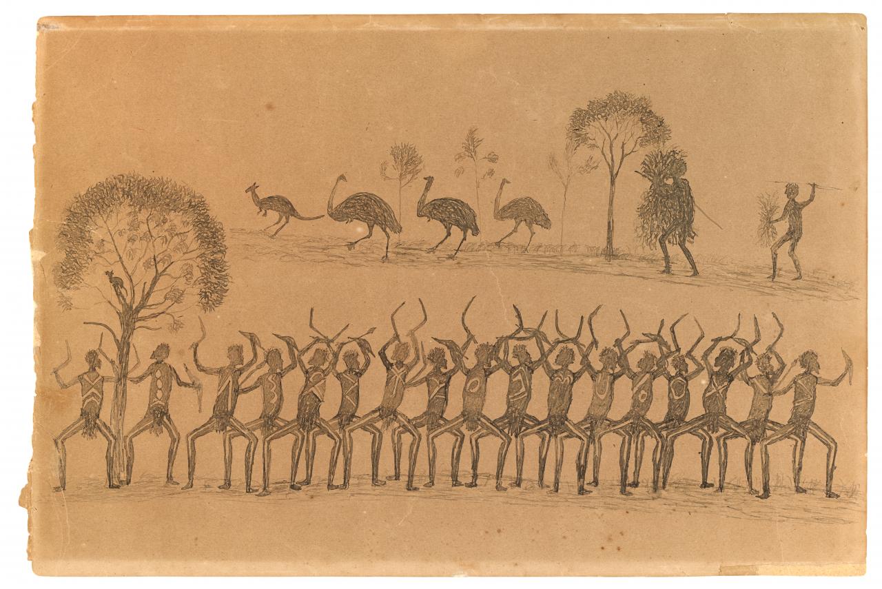 In each of these works, lines of decorated dancers have been drawn in silhouette, the figures differentiated from each other by individual body designs. The legs of the dancers, all bent at the same angle, lock together to give the impression of a group dancing in complete unison. The artist meticulously delineates details of body decoration and of material culture, including parrying shields and boomerangs that are peculiar to the Upper Murray region. In the second drawing, two camouflaged Aboriginal hunters are shown stalking three emu and a kangaroo, which are beautifully observed. Some lightly sketched saplings are indicated among the emu, to evoke a bush setting.