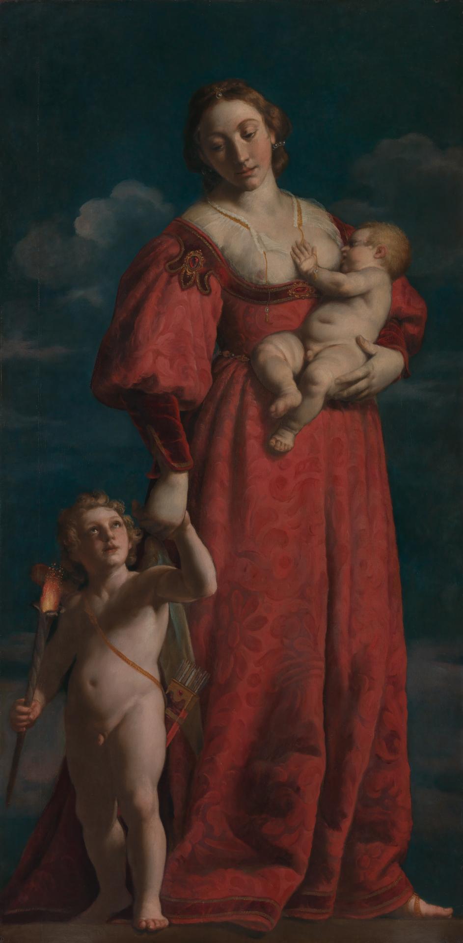 Turchi’s representation of Charity – like his Faith and Hope – closely follows Cesare Ripa’s widely known book of emblems, the lconologia (1604). According to Ripa, Charity (Carita) should be depicted clothed in a red dress; there should be flames surrounding her head; and an infant should be suckling at her breast as two other children play at her feet (one of these older children should be clutching Charity’s hand). In this painting, Turchi shrinks Ripa’s ‘flaming head’ to a single scintillating jewel upon Charity’s brow, and transforms the attendant children into the single figure of a torch-bearing amoretto, who is armed with a quiver of arrows.