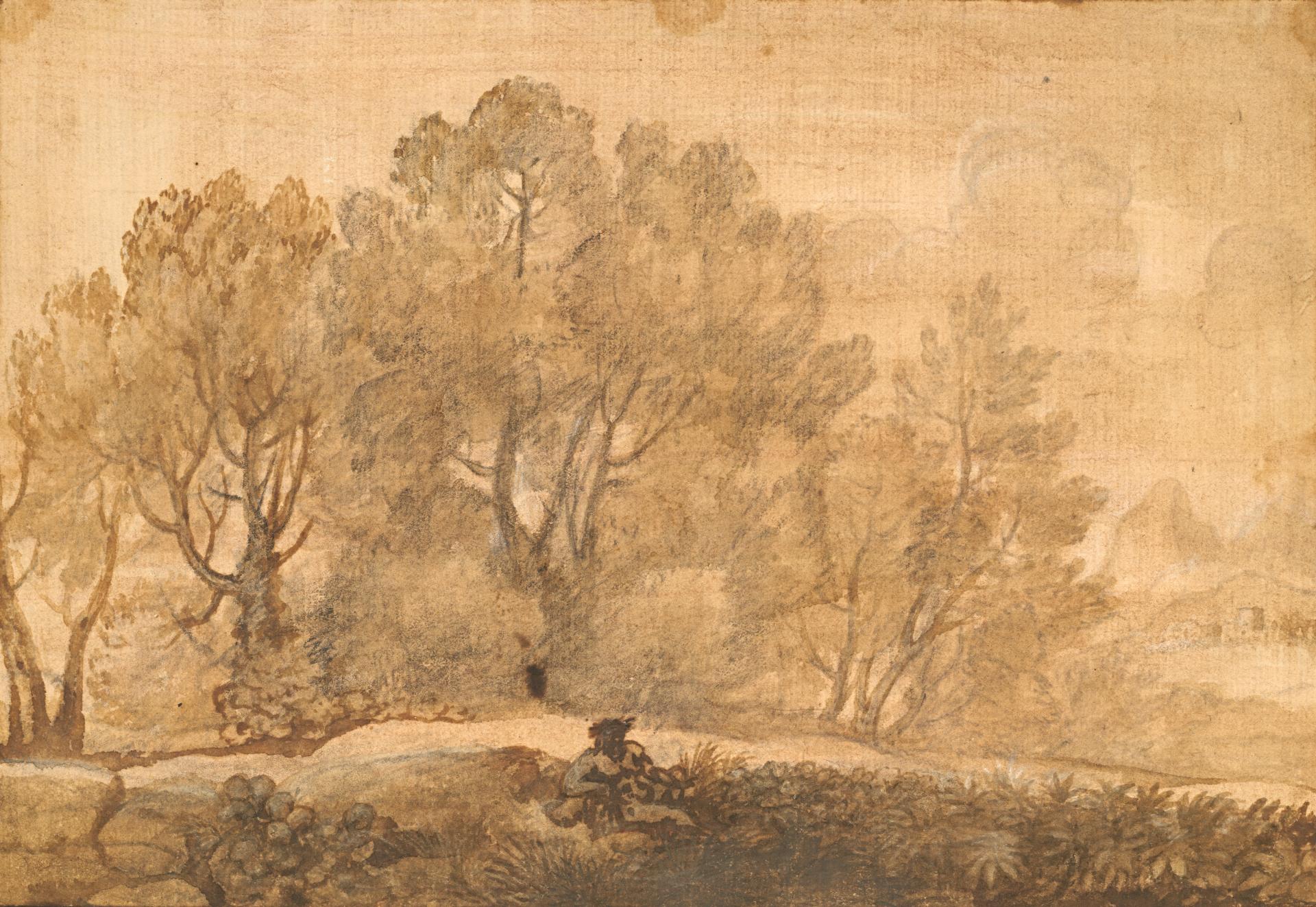 The superb Wooded landscape by Claude (fig. 1) is the most recent acquisition of an old master drawing for the National Gallery of Victoria. It is a page from the celebrated Wildenstein album, which first came to light in 1960, and is so called after the dealer who bought it.1 This, like all the pages from the Wildenstein Album, is an exceptionally well-documented drawing. All historical information in this note, including details of provenance, is taken from Marcel Rothlisberger’s publications: M. Rothlisberger, Claude Lorrain: The Wildenstein Album, Paris, 1962, no. 9: M. Roethlisberger, Claude Lorrain: The Drawings, Berkeley and Los Angeles, 1968, no. 877; M. Roethlisberger, The Claude Lorrain Album in the Norton Simon, Inc. Museum of Art, Los Angeles County Museum of Art, 1971, no. 33. The album, which is now dismembered, contained sixty drawings extending over the whole of Claude’s active life, each one being a work of the highest quality. Their uniform excellence and Claude’s known reluctance to part with his drawings, initially led Marcel Rothlisberger to surmise that Claude himself may have been responsible for collating the album.2 Μ. Rothlisberger, Claude Lorrain: The Wildenstein Album, p. 10. However, this hypothesis was soon rejected on the grounds that the arbitrary sequence is unlikely coming from the artist, that the sheets include non-sequential numbering, that some of them had already been mounted earlier, and that some of the drawings had been trimmed.3 M. Roethlisberger, The Claude Lorrain Album, p. 7. The album cannot be dated before 1677, the date of the latest drawing, and its make-up, when still intact, suggested a date around 1700.4 ibid., p. 6. It would therefore appear that the album was put together at some time between Claude’s death in 1682 and 1713, the year in which its first certain owner died. Considering the exceptional quality of the drawings, they must have been selected from stock left in his studio by someone with an intimate knowledge of Claude’s work, possibly with the help of one of three heirs who lived with him – a daughter and two nephews. Claude’s death inventory of 16825 M. Rothlisberger, Claude Lorrain: The Paintings, New Haven, 1961, vol. I, pp. 73–76. includes twelve books of sketches, the Liber Veritatis, and a chest full of prints and drawings, and Baldinucci reports on ‘five or six great books … of these drawings of views from nature’, plus ‘some bundles of loose sheets’.6 ibid., pp. 53–62, for Baldinucci’s life of Claude, esp. p. 62.