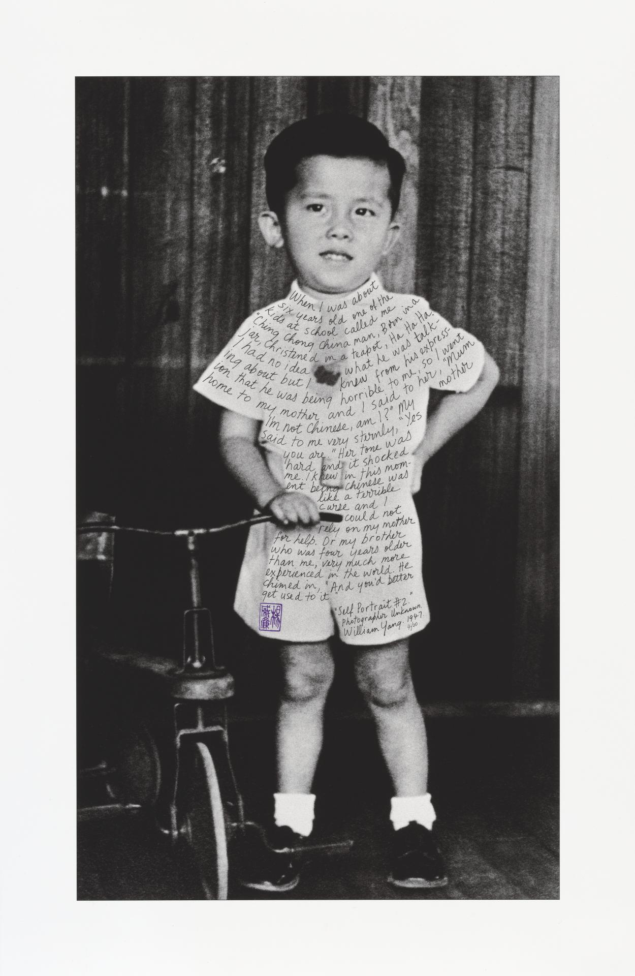 I brought Portrait #2 up on both of our screens at this point – a photo of William as a child. On his shirt, he wears the account of his first experience of being bullied because of his race. Unaware of his own cultural heritage at the time, William returned home from school that day and asked his mother if he was Chinese. ‘Yes, you are’, she replied. William’s handwritten recollection continues, ‘Her tone was hard and it shocked me. I knew in this moment being Chinese was like a terrible curse and I could not rely on my mother for help’.