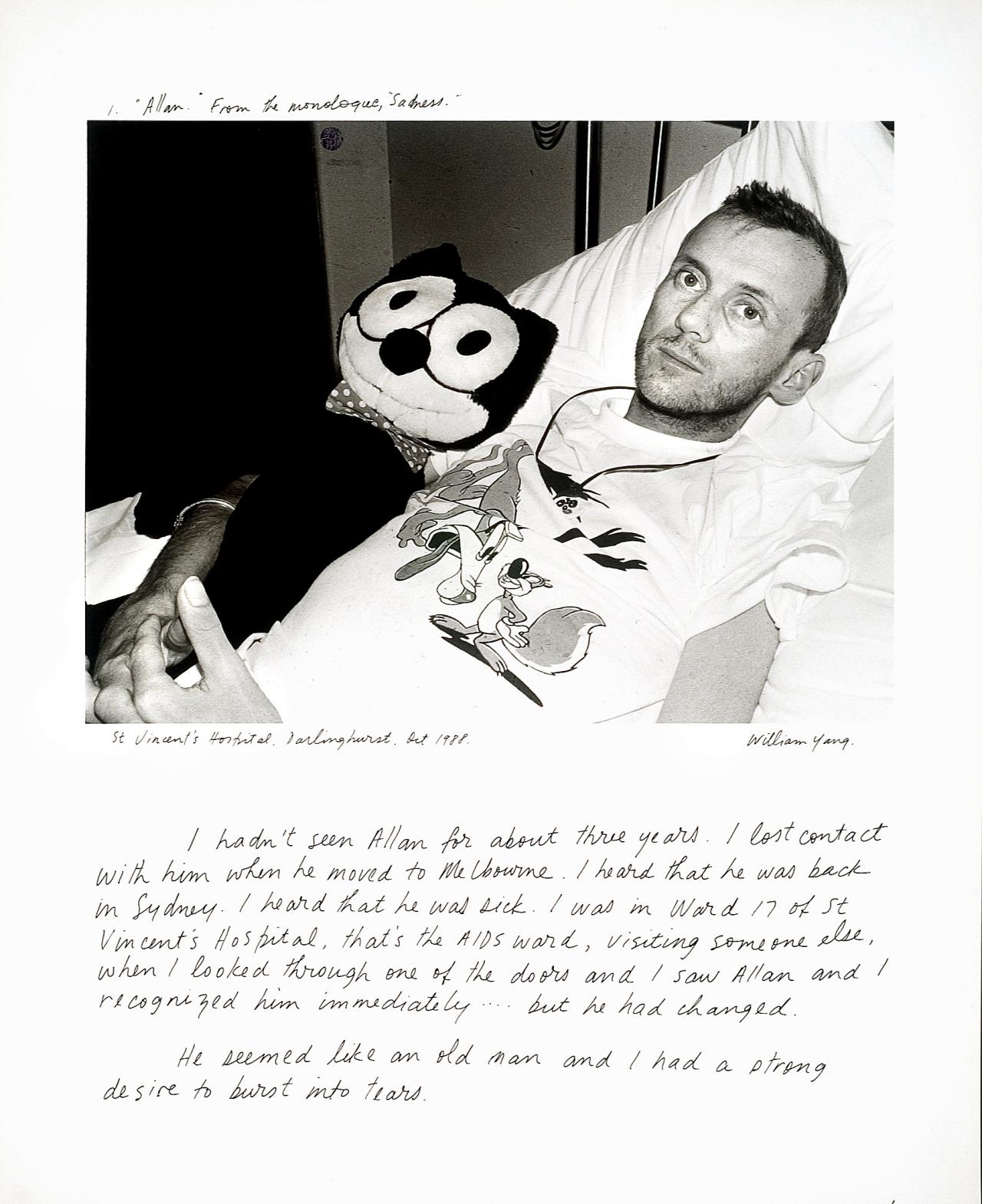 The text reads: ‘I hadn’t seen Alan for about three years. I lost contact with him when he moved to Melbourne. I heard that he was back in Sydney. I heard that he was sick. I was in Ward 17 of St. Vincent’s Hospital, that’s the AIDS ward, visiting someone else, when I looked through one of the doors and I saw Allan and I recognised him immediately… but he had changed. He seemed like an old man and I had strong desire to burst into tears’.