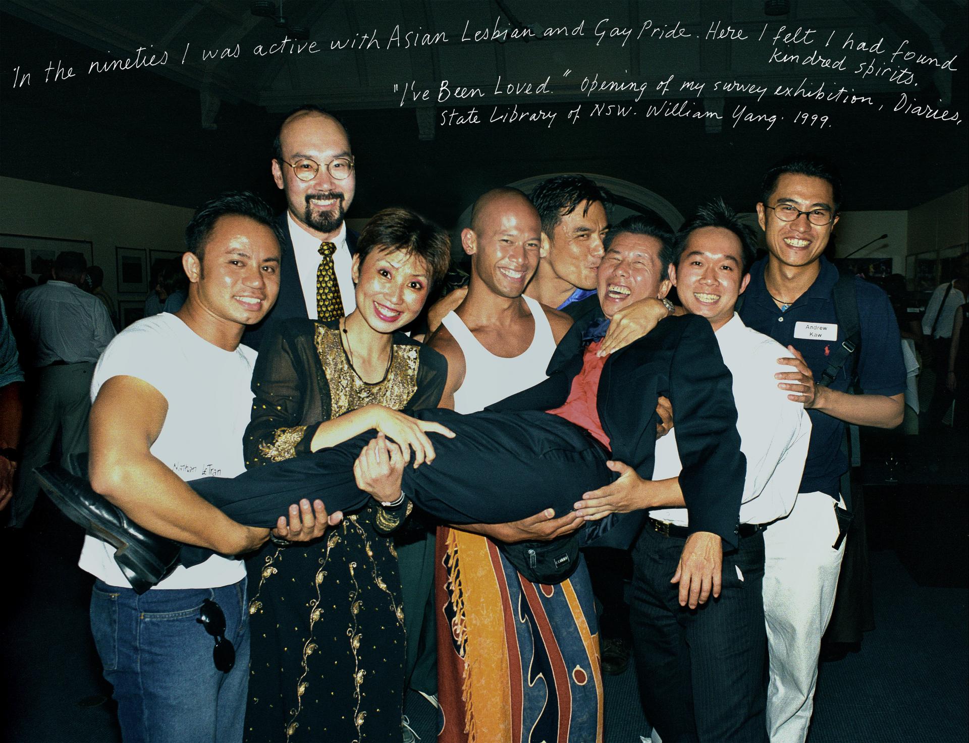 While preparing to write this piece for the queer edition of the NGV’s Art Journal, I spent my weekends watching – in tears – William’s performances online.4Tony Ayres, ‘Sadness: a portrait of photographer William Yang’, Kanopy, www.kanopy.com/product/sadness-portrait-photographer-william-yang, accessed 11 Aug. 2021; and Martin Fox, ‘Friends of Dorothy’, Vimeo, vimeo.com/ondemand/williamyangfod, accessed 9 Aug. 2021. I trawled through archives of his work, reading a couple of his monographs (Friends of Dorothy,5William Yang, Friends of Dorothy, Pan Macmillian, Sydney, 1997. Seeing and Being Seen),6Queensland Art Gallery of Modern Art, Seeing and Being Seen, Queensland Art Gallery of Modern Art, Brisbane, 2021. and reading articles7John McDonald, ‘Devastating and intimate: the landmark photos that stop viewers in their tracks’, Sydney Morning Herald, 1 Apr. 2021, www.smh.com.au/culture/art-and-design/why-you-can-identify-with-the-story-of-photographer-william-yang-20210329-p57ez5.html, accessed 12 Oct. 2021; Peter Wilkings, ‘Review: William Yang’s Blood Links at Canberra Theatre an engrossing story of family’, Sydney Morning Herald, 13 Apr. 2016, www.smh.com.au/entertainment/theatre/review-william-yangs-blood-links-at-canberra-theatre-an-engrossing-story-of-family-20160413-go5kv7.html, accessed 12 Oct. 2021. written about him, eager to understand how others8Marcus Bunyan, ‘Review: “William Yang: seeing and being seen” at the Queensland Art Gallery | Gallery of Modern Art (GOMA), Brisbane, 15 Aug. 2021, artblart.com/2021/08/15/review-william-yang-seeing-and-being-seen-at-the-queensland-art-gallery-gallery-of-modern-art-goma-brisbane/, accessed 12 Oct. 2021; Gina Fairley, ‘Exhibition review: William Yang, Seeing and Being Seen, QAG’, ArtsHub, 31 Mar. 2021, www.artshub.com.au/news/reviews/exhibition-review-william-yang-seeing-and-being-seen-qag-262227-2370528/, accessed 12 Oct. 2021; and Chari Larsson, ‘Tenderness, desire and politics: William Yang’s work is a portrait of life well lived’, The Conversation, 7 Apr. 2021, theconversation.com/tenderness-desire-and-politics-william-yangs-work-is-a-portrait-of-a-life-well-lived-158413, accessed 12 Oct. 2021. have come to perceive him. Through my own writing, I wanted to highlight the healing power of his work.