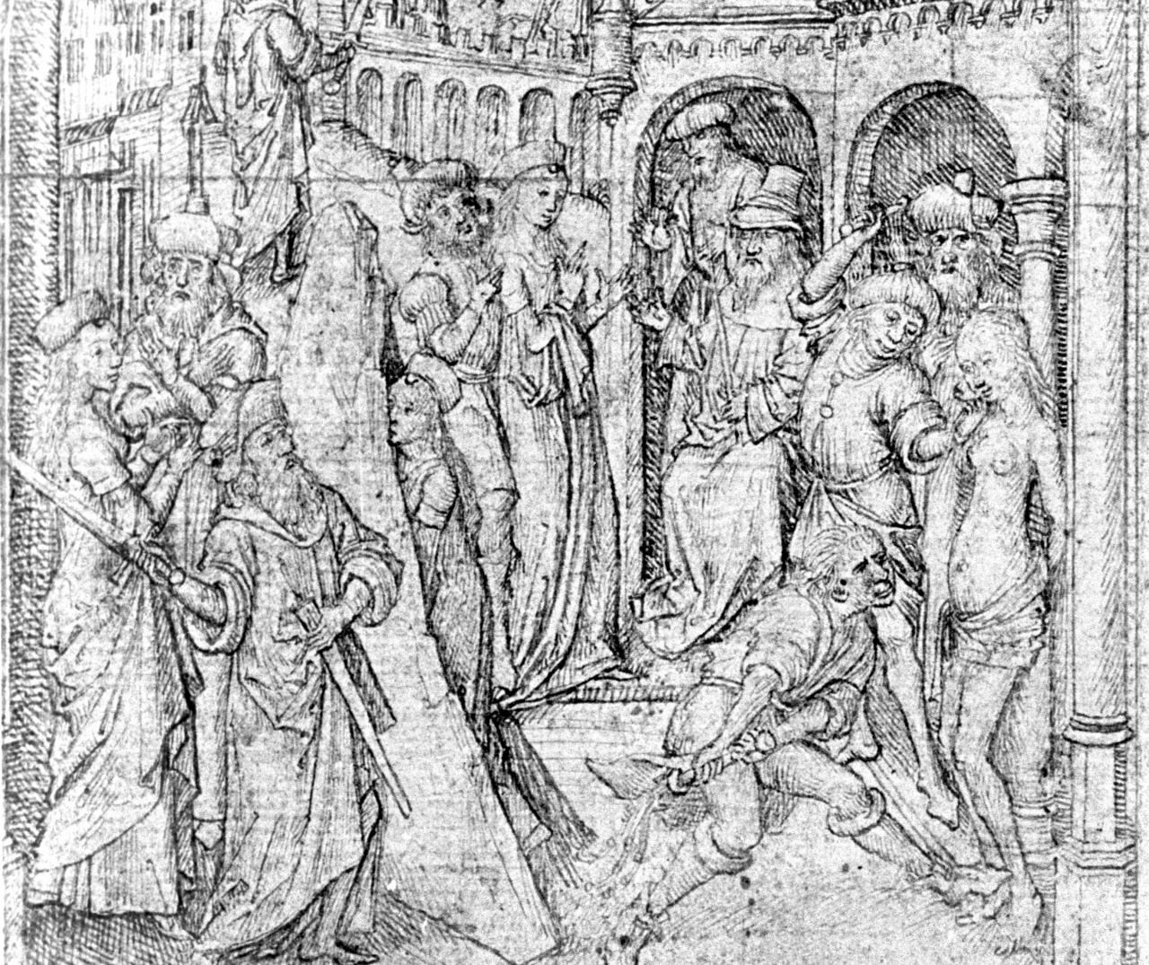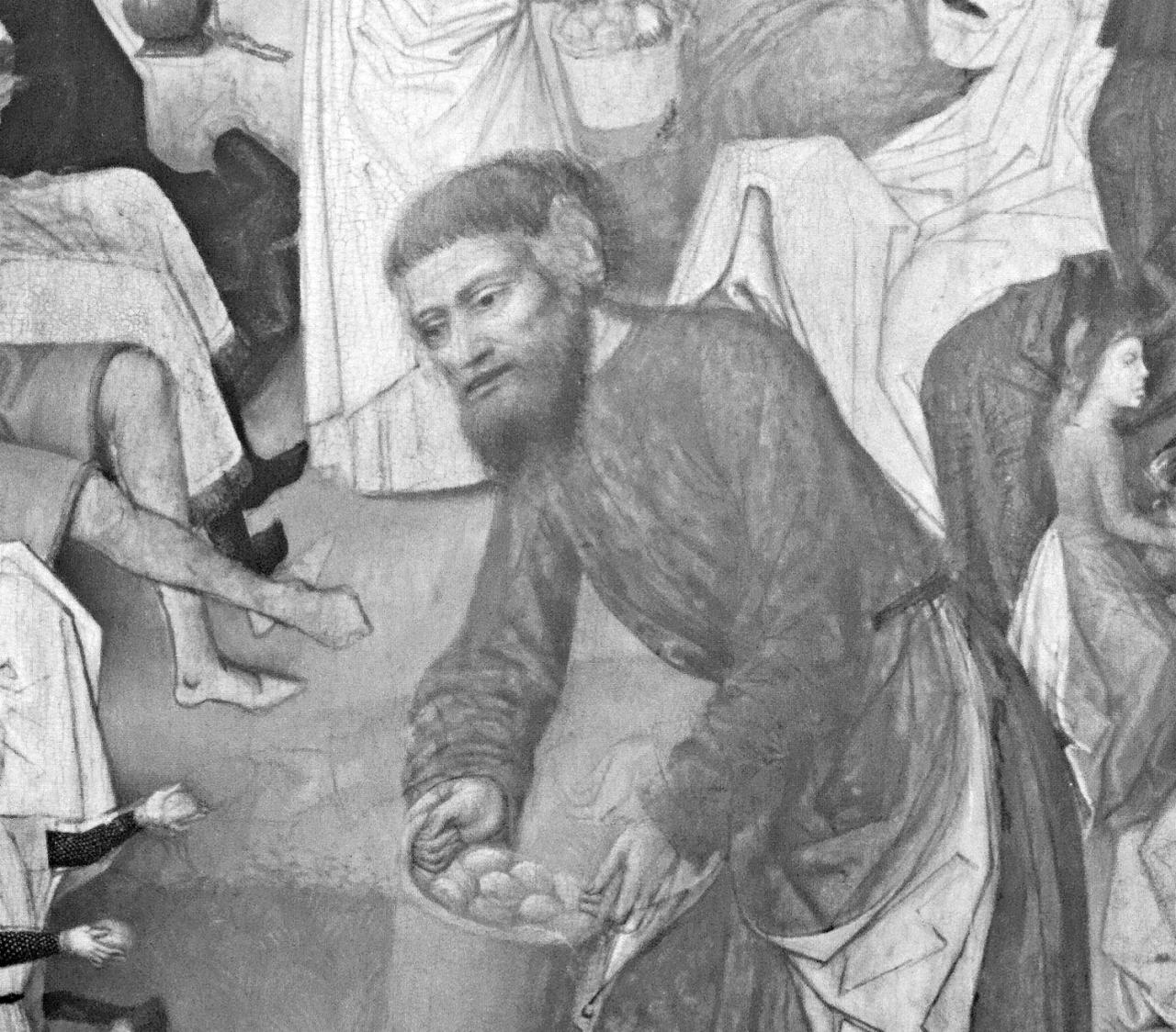Compositional changes with implications for the narrative have similarly been introduced by the artist between the preliminary drawing and the execution of the painting. The most spectacular of these occurs in the figure of St Peter, who originally held out his right arm in order to receive a loaf of bread from the little boy standing before him, while in his left hand – which has also been repositioned – he held the handle of the basket (fig. 4). Here the Master must have modified his vision in the course of execution, doubtless out of a desire to more effectively focus attention on the principal actor in the narrative by leaving space between him and the rows of courtiers at either side. It is amusing to see that when the composition took its final, painted form there was no correction made to the gesture of the child, who now offers a loaf in each hand.
