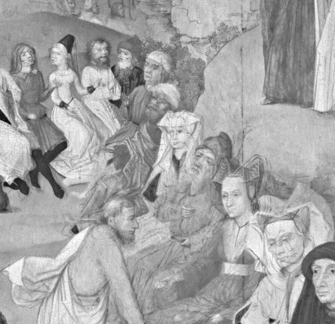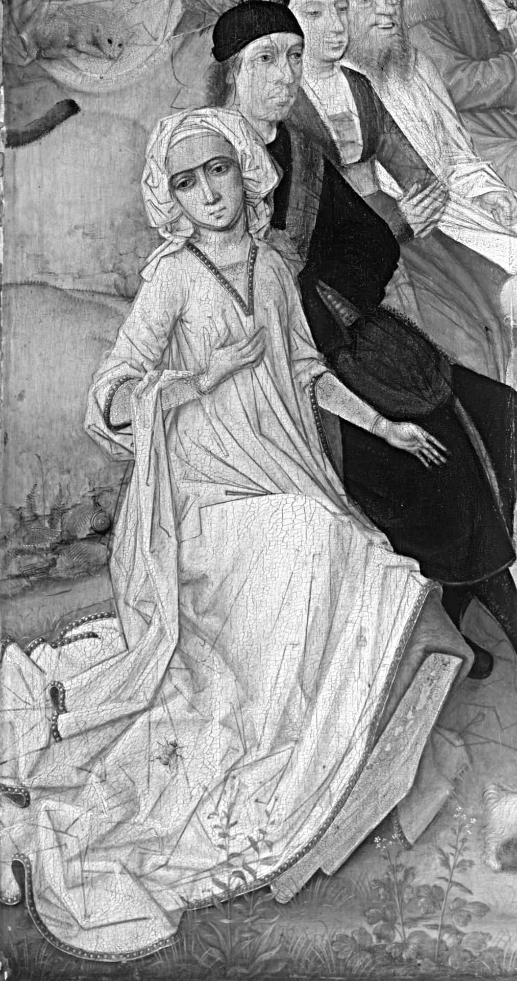 Similar modifications may be observed in several other figures of the assembly – principally in the faces and headdresses of two of the women in the grouping at the right, and in the figure of the bearded man to the left of the woman with the high wimple (fig. 3). The positioning of some of the feet and knees has also been modified, in order to make the highly artificial poses of the figures more convincing.