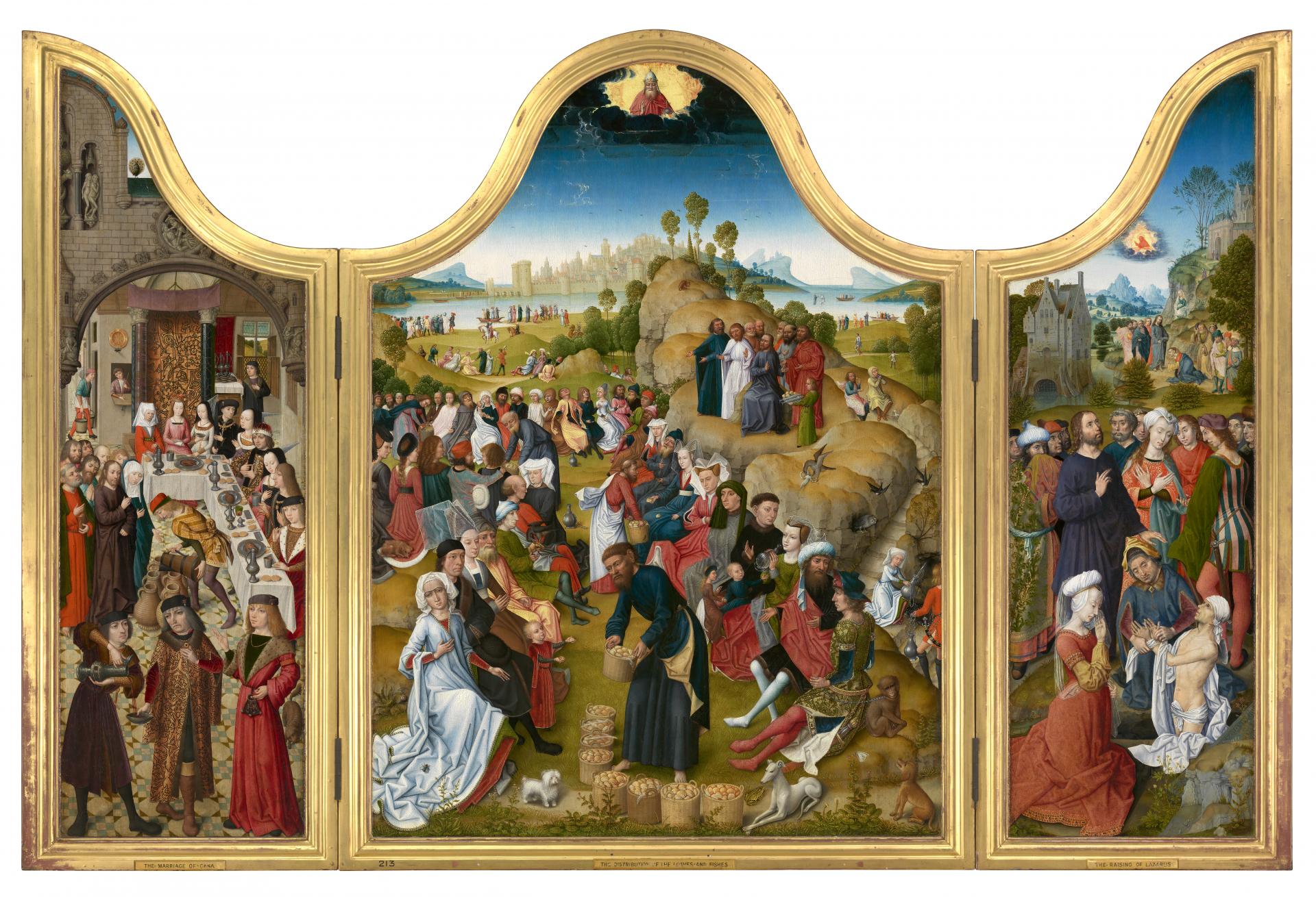 In conclusion, the altarpiece of the Miracle of the loaves and fishes is a work that has come from the Brussels workshop of the Master of the Legend of St Catherine, who has portrayed himself in one of its wings. Five artists, some of whom were already accustomed to collaborating, have participated in its execution: the Master of the Legend of St Catherine (the centre panel, The miracle of the loaves and fishes), the Master of the Portraits of Princes (the left wing, The Marriage at Cana), the Master of the Legend of St Barbara (the right wing, The Raising of Lazarus), the Master of the Magdalene Legend (The Rest on the Flight to Egypt on the reverse of the left wing), and finally the Master of the Embroidered Foliage, aided by an assistant and perhaps by the Master of the Legend of St Barbara (the St Peter on the reverse of the right wing).34Friedländer, vol. XII, p. 14, distinguished three hands: the Master of the Legend of St Catherine for the centre panel; the Master of the Portraits of Princes for the front and back of the left-hand wing; and the Master of the Embroidered Foliage for the front and back of the right-hand wing.