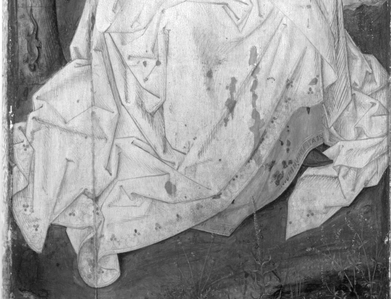 An examination of this work using infrared reflectography reveals a rapid sketching of the forms and volumes (figs 16b & 16c), as well as some pentimenti in the placement of the landscape elements – such as a slight shift towards the left in the case of the church tower. The underdrawing of the folds of the drapery starts off as lines that are spare and angular in form, and of the type executed by the Master of the Legend of St Catherine – which seems to us, in a more general sense, to be specific to the Brussels School. It occurs in particular in the work of several of the artists from the Master’s workshop.33The underdrawing of the gown of the angel, and of that of the Virgin, in the Annunciation altarpiece at the Musées Royaux des Beaux-Arts de Belgique – a work attributed to the Master of the Magdalene Legend – presents the same type of drawing: it is very spare and has been used solely for the placement of the folds. In this particular example, the drawing has been followed faithfully in the painting, the right-angled line ends being an indication of the area occupied in the painting by the angles of the folds. The handling of this drawing is hesitant in places, while the lines of some of the folds have been reworked – there is enough treatment of this kind as to perhaps betray the use of a model from a pattern book. In other areas we find bands of short hatchings that follow the direction of the folds or indicate their creases, and also emphasise some of the areas of shading; this denotes a desire, which is non-existent in the panel by the Master of the Legend of St Catherine, to be explicit about the volumes in the light areas.