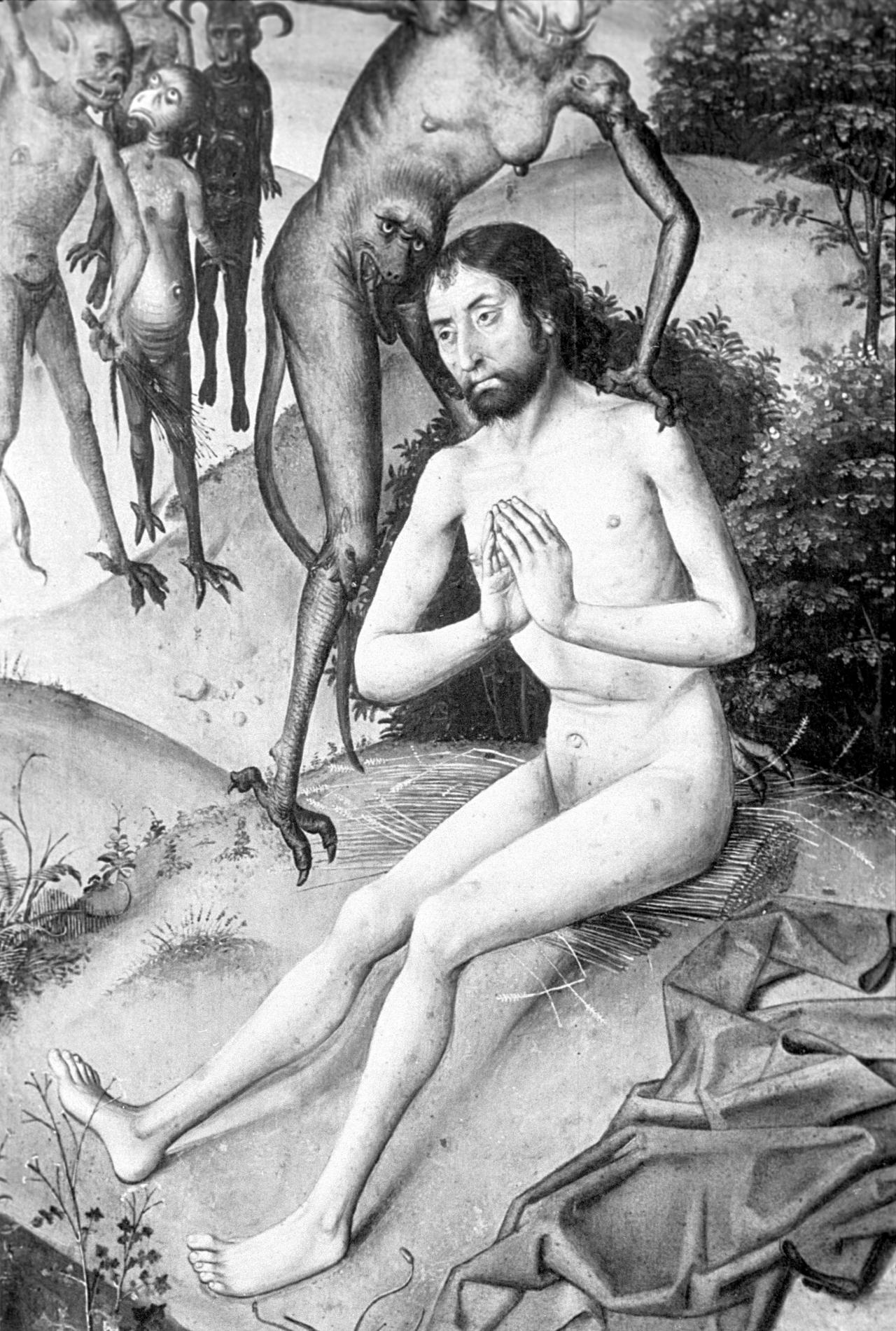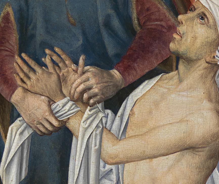 The preliminary drawing also reveals the existence of several pentimenti, for example in the positioning of the crossed hands of Martha and in the belt of the soldier. In addition, haloes drawn around the heads of Christ, St Peter and Mary have not been carried through to the painting. Modifications have also been made to details in the landscape: a church steeple and a cottage have been abandoned, while the distribution of the trees on the rock in the right background has been altered. Furthermore, the figure of God the Father in the sky was originally drawn frontally, as in the centre panel, but was later painted in profile, in an attitude identical to that seen in the Banquet of the Cologne altarpiece.