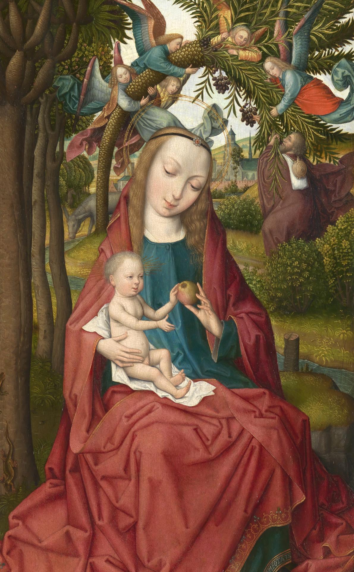However, the format and manner of presentation, which are different in the two works, make a more thorough comparison difficult. This is particularly the case because in the Melbourne wing the landscape occupies a very important place in the composition, which has been inspired (in terms of the angels on the date palm, the dragon tree, and the motif of St Joseph and the ass) by a Martin Schongauer engraving dating from around 1470.32See Le Beau Martin: Gravures et dessins de Martin Schongauer (vers 1450–1491) (exh. cat.), Musée d’Unterlinden, Colmar, 1991, pp. 264–5.