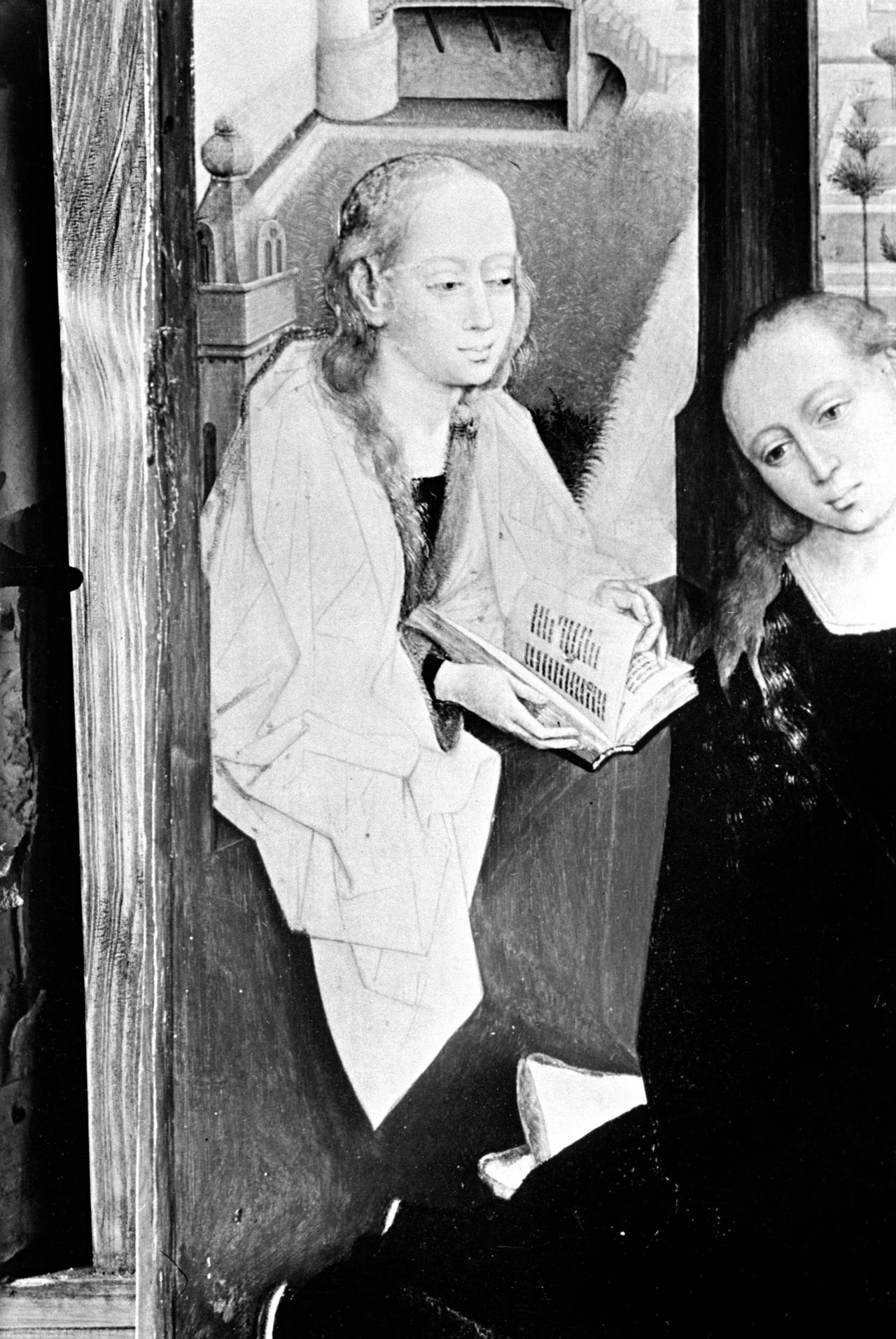 34 Friedländer, vol. XII, p. 14, distinguished three hands: the Master of the Legend of St Catherine for the centre panel; the Master of the Portraits of Princes for the front and back of the left-hand wing; and the Master of the Embroidered Foliage for the front and back of the right-hand wing.