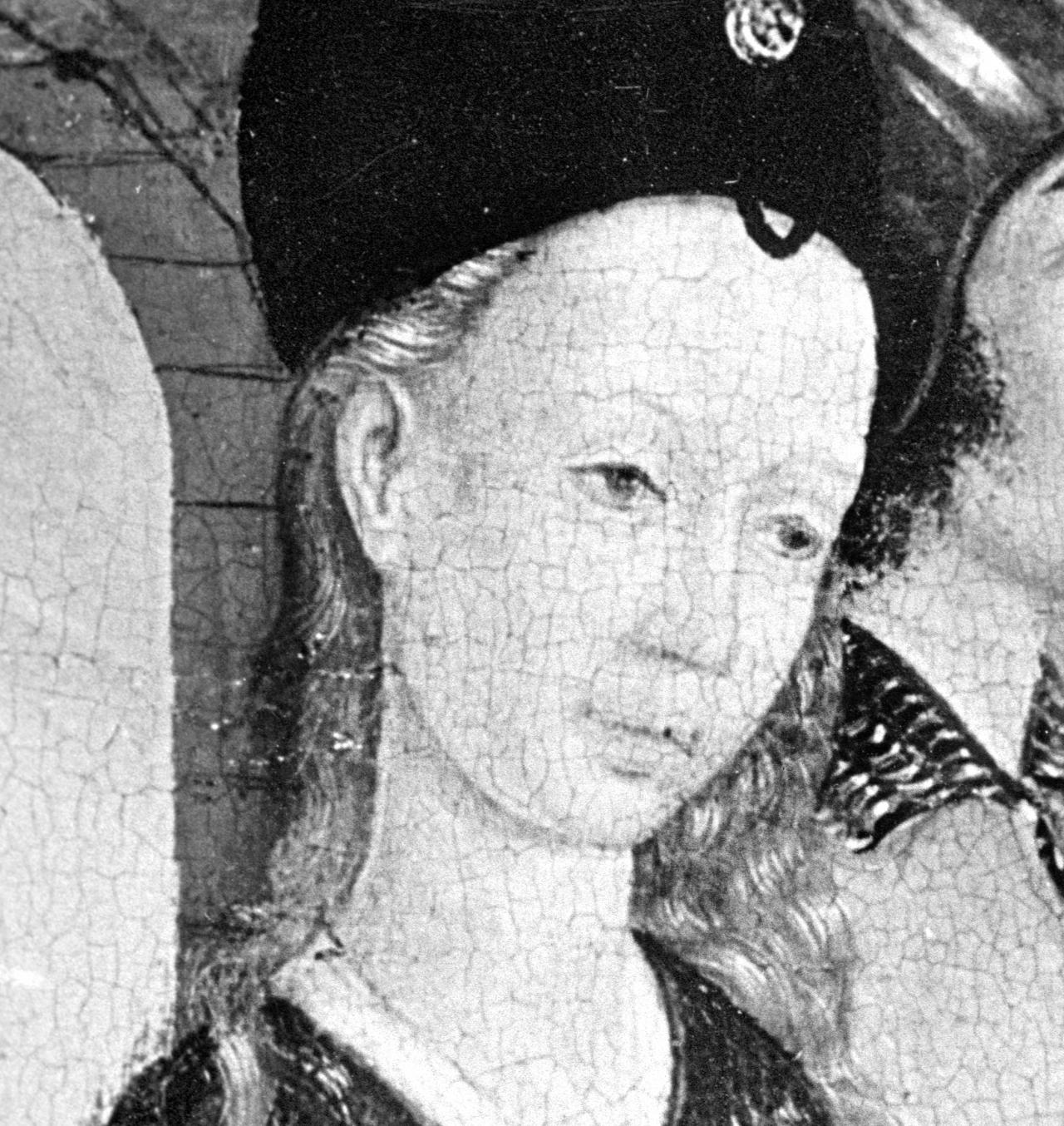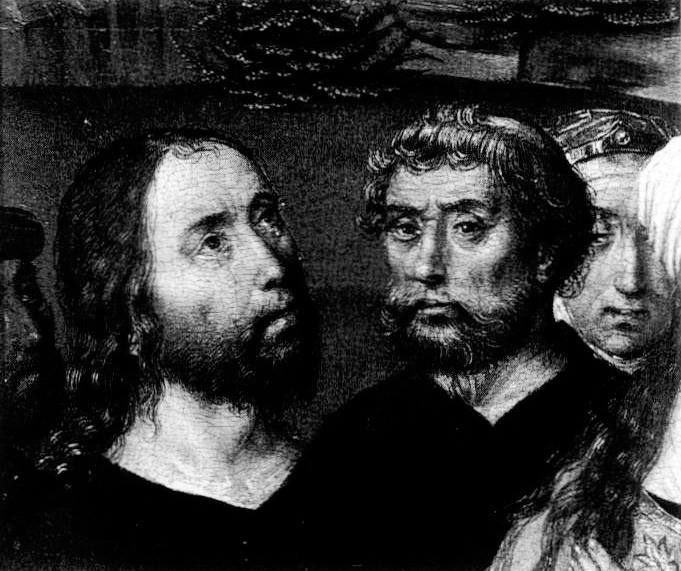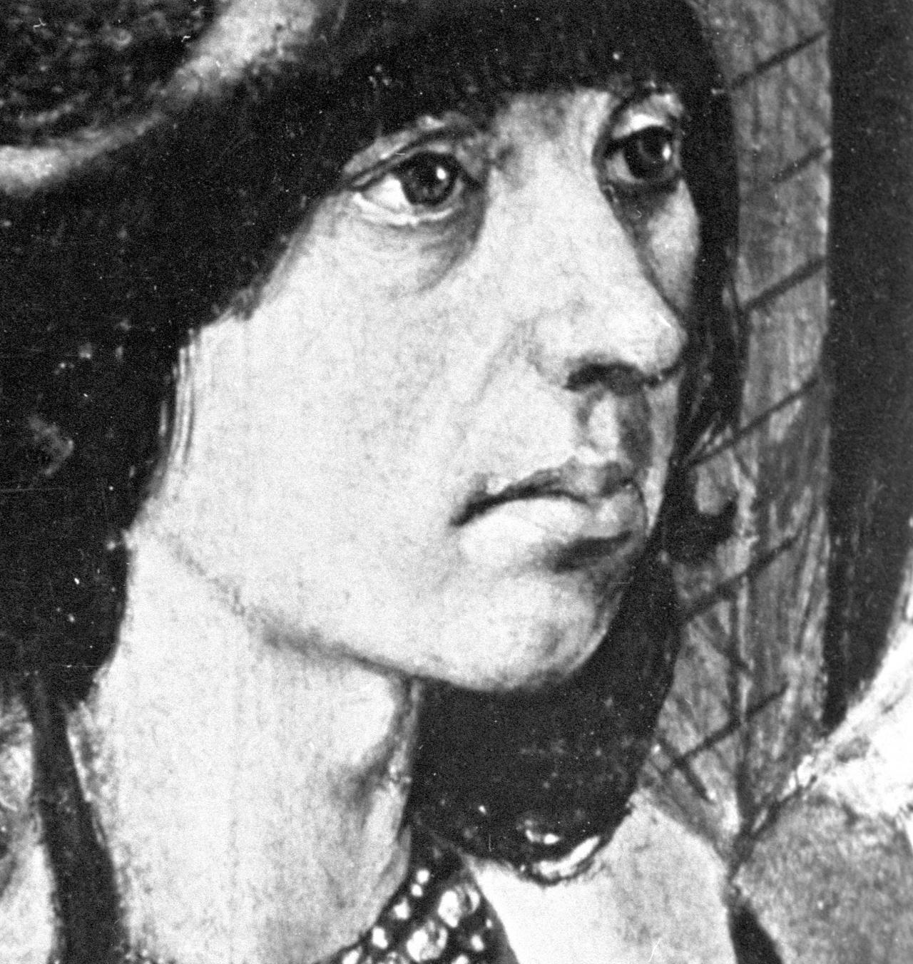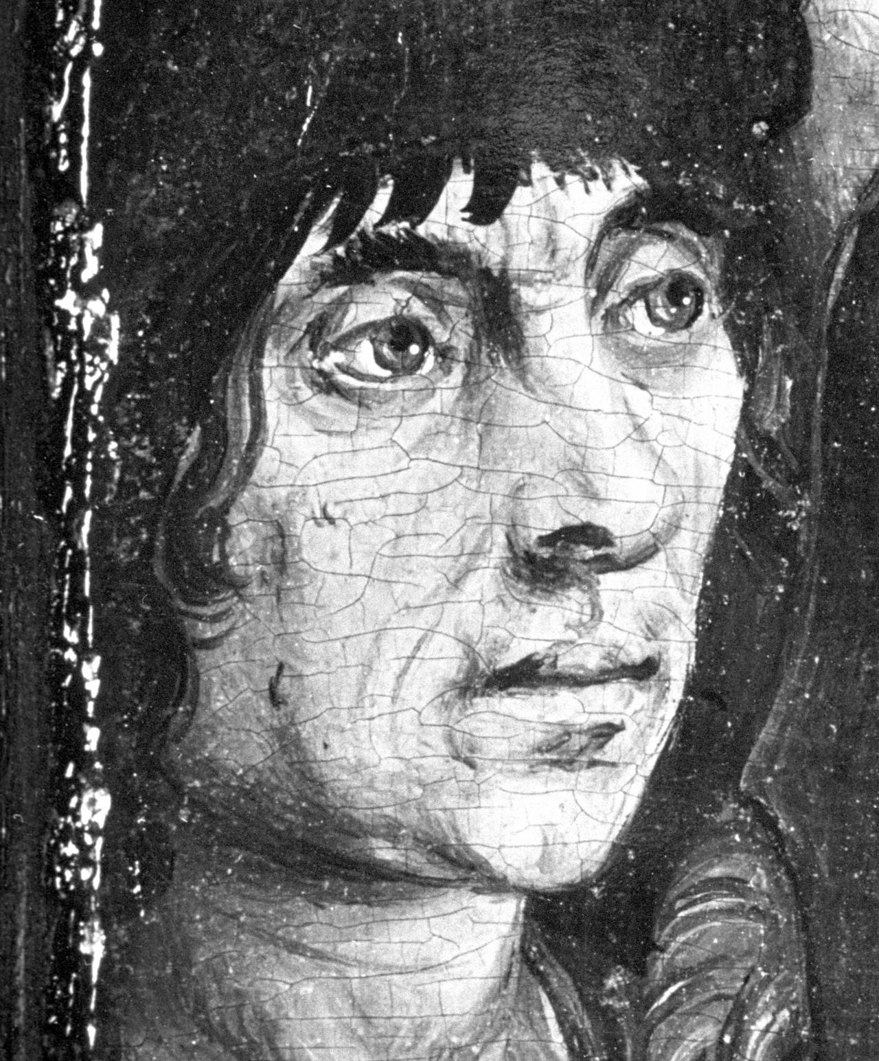 To close the study of this panel, we would like to turn to the male figure seated second from the front on the left (figs 7a & 7b). Ought we not recognise a self-portrait of the artist in this figure, which has never engaged the attention of art historians (whereas several identifications have been proposed for the other individuals)? His mode of dress, which is very sober, distinguishes him from his companions; the bonnet and the fur-lined robe, or tabbaert, are in other pictures worn by members of the bourgeoisie, and especially by painters. Furthermore, among so many stereotyped faces, his seems to be more individualised. Although his features correspond to a typical schema – this is common in portraits painted at the end of the fifteenth century – the man seems to command attention by the determined expression of his mouth and the greater intensity of his gaze.