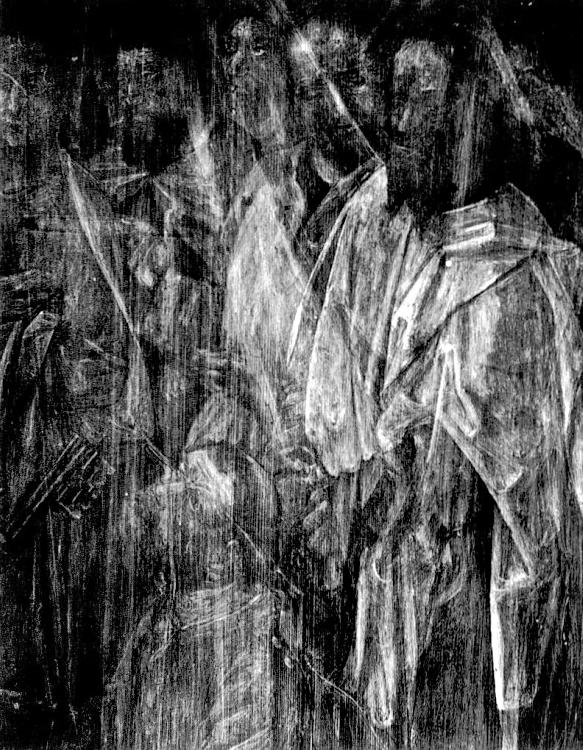 9 The radiographic image shows that this figure has not been superimposed on a pre-existing figure. The volumes of her gown, which occupies an important part of the foreground, have, on the other hand, been adapted to the surrounding space: as we have seen, a tail of cloth in the drawing has been omitted from the painting – obviously so as to leave room for the legs of the figure we believe to represent the painter. Nevertheless, there is a striking contrast between the well-spaced distribution of the six principal figures on the right and the abnormally tight distribution of the seven figures in the group at the left. Turned in an artificial manner towards the viewer, the woman seems isolated from the group and leaves little room for the figure beside her, which must have been subjected to a distortion of the planes between the bust and the lower part of the body. Finally, we may ask ourselves whether it might not be the case that at the time of executing the painting the artist decided to add his own portrait to a model-figure – this seems all the more possible when we consider that a careful examination of the underdrawing reveals another male face, presented in profile and slightly receding in relation to the alignment of the figures. We can clearly see the contour of his headdress, as well as the eye, the nose, the chin and the mouth, under the present right cheek of the figure we believe to be the painter. Only new laboratory examinations, with more precision in their definition (infrared reflectography and radiography of the whole surface of the composition), will be able to confirm this latter hypothesis.