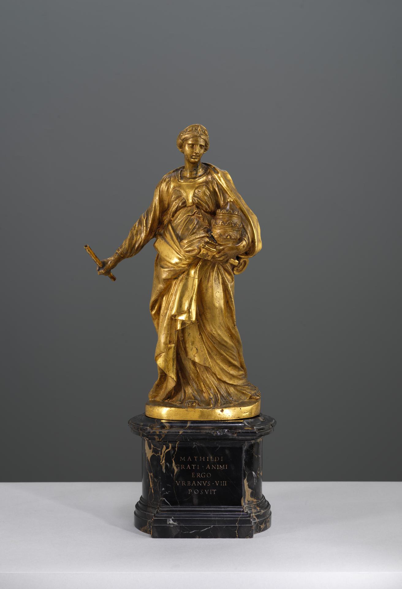La reputazione della contessa Matilde e la sua fedeltà al papato colpirono la Roma della Controriforma durante il XVI e l’inizio del XVII secolo, e fu particolarmente venerata da Papa Urbano VIII (Barberini). Nel 1633 Papa Urbano VIII ordinò che le sue spoglie venissero traslate da Mantova per essere inumate nella Basilica di San Pietro a Roma, diventando così la prima donna ad essere sepolta nella Basilica. Urbano VIII commissionò a Gianlorenzo Bernini, il principale artista e architetto del Vaticano, la creazione di un monumento commemorativo per lei, che fu collocato in una nicchia della navata centrale di San Pietro. Il monumento include una scultura in marmo della contessa a grandezza naturale, di cui questa figura in bronzo dorato è una variante ridotta. Bernini ha simboleggiato il suo potere e il suo sostegno al papato raffigurandola mentre agita il bastone del comando nella mano destra e stringe il triregno pontificio nell’incavo del braccio sinistro. Nella stessa mano, la Contessa tiene in mano le preziose chiavi di San Pietro, un gesto simbolico solitamente riservato alle effigi dei santi.