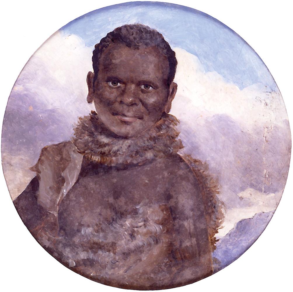 The process of removing Tasmanian Aboriginal survivors to Flinders Island in the early 1830s supported the commonly held myth of a dying race. This absence also meant that Dowling’s contact with Tasmanian Indigenous people was minimal. Further, it appears Dowling’s interactions with Aboriginal people only started once he moved from Van Diemen’s Land to Victoria in the 1850s. Instead, Dowling based the faces of the Aboriginal subjects in his paintings on the graphite and watercolour drawings by Thomas Bock who had been commissioned to undertake the portraits by Lady Franklin, the wife of Sir John Franklin, the governor of Van Diemen’s Land, 1836–43. Bock took great care to reproduce accurately the faces and record the names of the Aboriginal people he painted, which implies a high level of cross-cultural engagement and authenticity (figs 6 & 7).