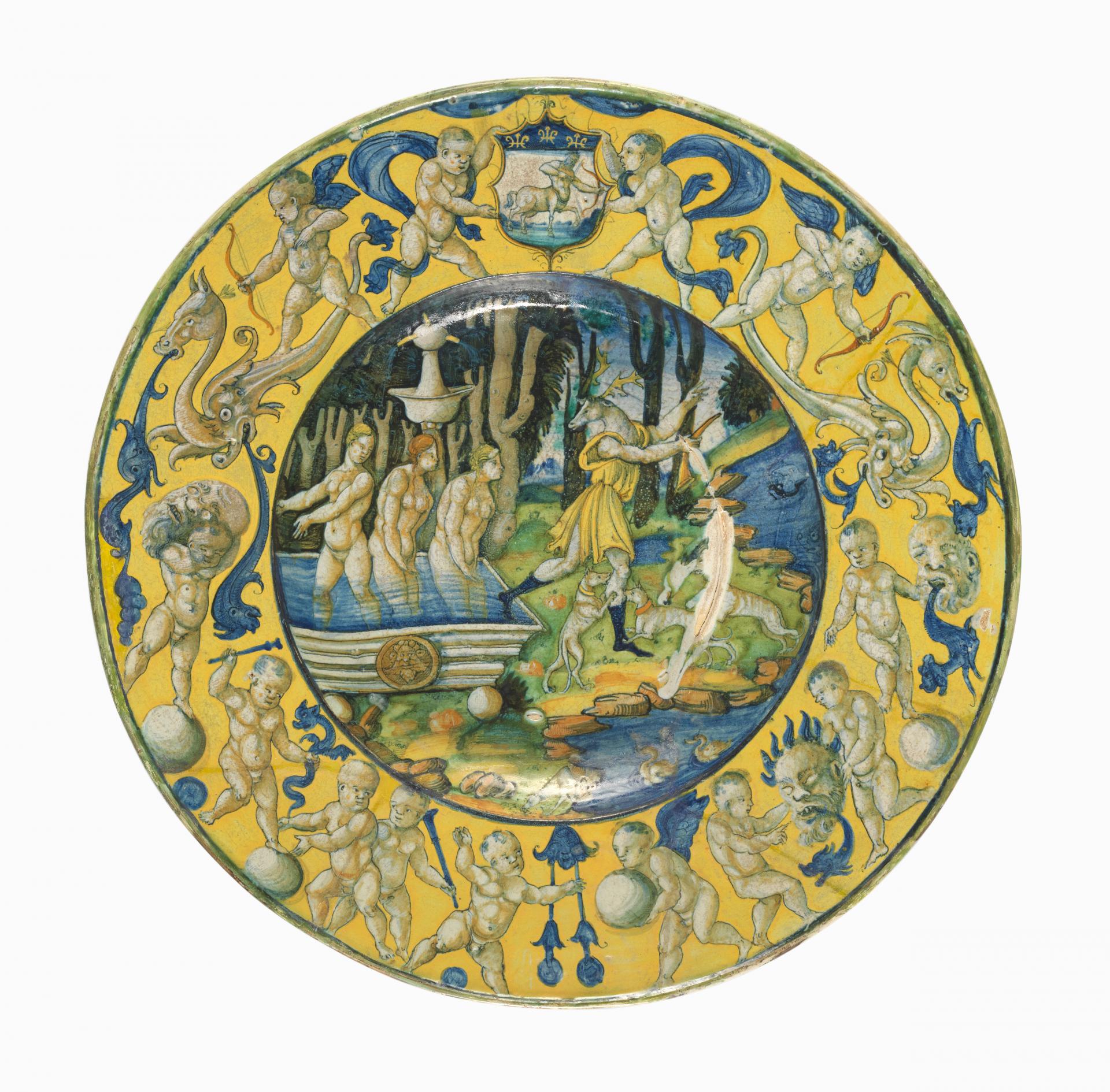 La storia di Diana e Atteone è narrata nel terzo libro delle Metamorfosi di Ovidio. Atteone stava prendendo parte in una battuta di caccia quando si imbatté per caso nella dea Diana e nelle ninfe che facevano il bagno nude. Atteone fu punito con la trasformazione in cervo e venne poi divorato dai suoi stessi segugi. La scena al centro di questo piatto raffigura Atteone mentre si trasforma in cervo e viene attaccato dai suoi cani. Il piatto si distingue per l’ambizione della scala e la complessità della decorazione, ma il luogo di produzione rimane incerto. Le prove disponibili indicano che la Toscana sia la regione di produzione più probabile.