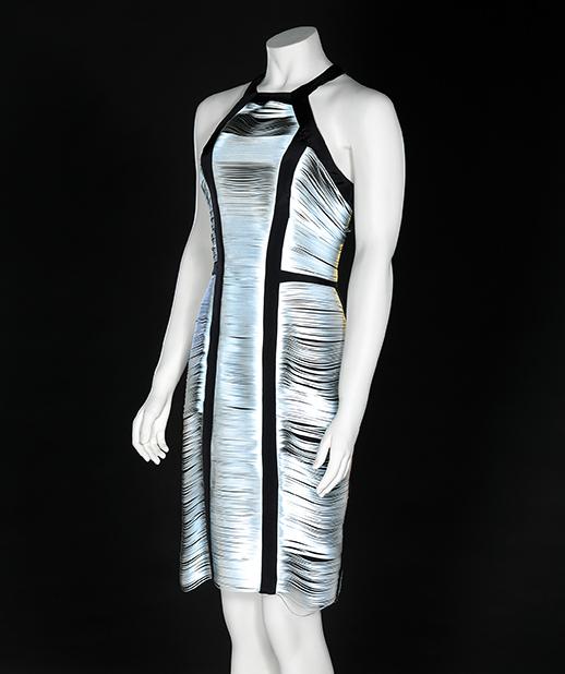Vein sleeveless dress, 2012, encapsulates the original thinking and technical ingenuity that has defined Lee’s work over the past few seasons. The sleeveless dress, body-conscious in style with a racer-back neckline, is comprised of black stretch knit fabric overlaid with floating strands of thinly sliced high-visibility fabric. The disciplined silhouette shows Lee’s almost architectural approach to tailoring, with black structural panels demarcating the waist, torso and décolletage. Tracing a cool, sexy line across the body, this foundation has been cleverly softened and animated by the judicious application of reflective fringing.