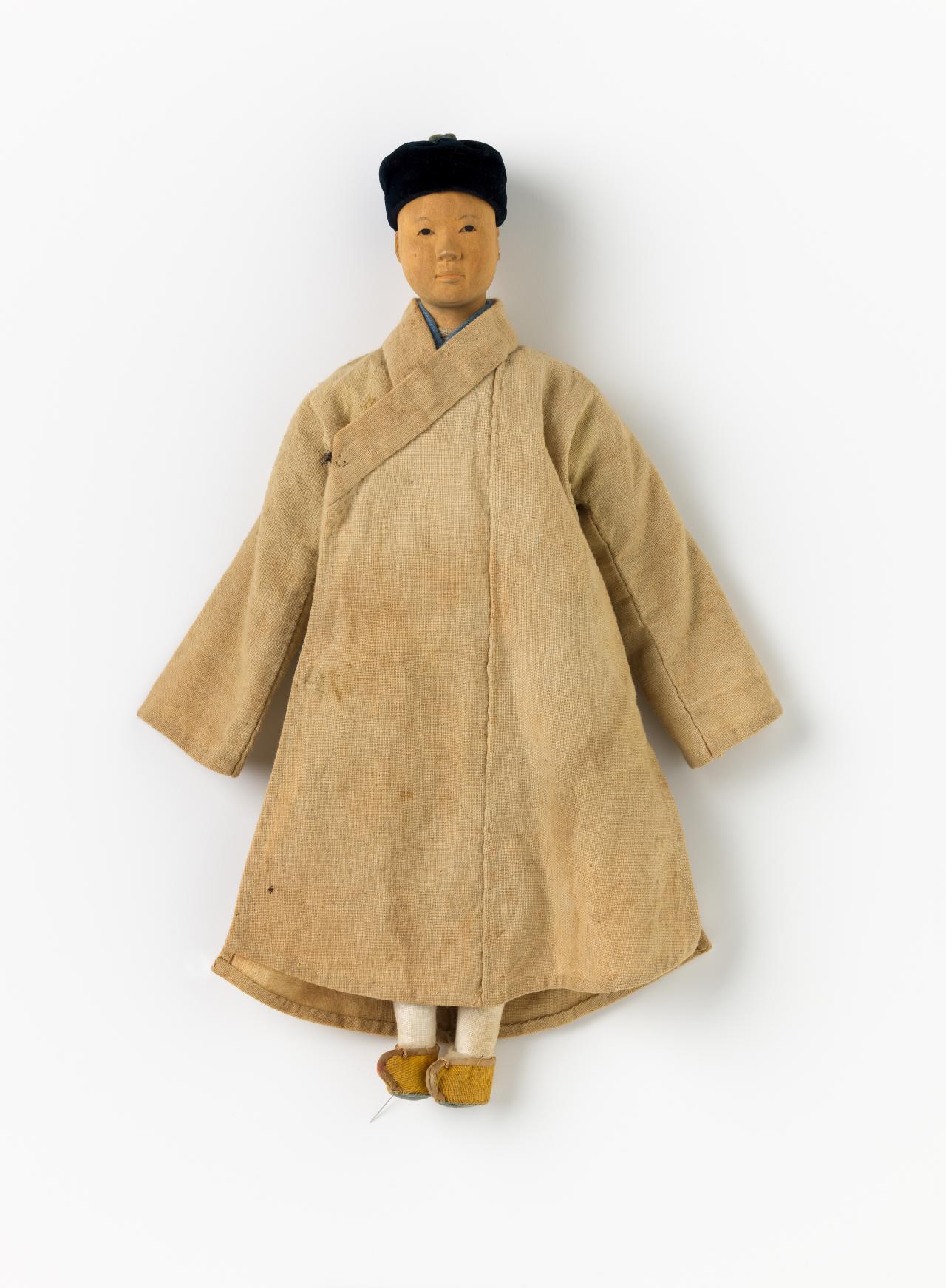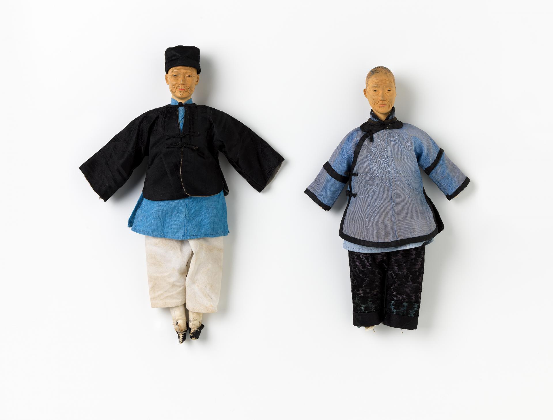 The Door of Hope’s operations were severely restricted by a lack of funding in its initial years, rendering the mission reliant on the intermittent charity of local organisations such as the Rotary Club of Shanghai and the American Women’s Club, and the ‘kind assistance of a number of Chinese gentlemen’.10 Woman’s Work in the Far East, p. 188. To help ease the mission’s financial burden, Industrial Home residents could undertake various productive activities in exchange for food, ongoing board and, during profitable periods, a small stipend. One such activity was the manufacture of dolls, which resulted in perhaps the mission’s only known material legacy. The heads of these dolls were finely carved from pear wood by local artisans before residents painted in delicate facial features and hairstyles, and made bodies from stuffed muslin. Once assembled, the dolls were dressed from under- to outerwear in up to five layers of clothing, with each garment painstakingly woven and sewn by hand. The realistic costumes of the dolls represented different roles and classes in Chinese society, cultivating a degree of cultural pride that the missionaries deemed essential to the successful Christianisation of their charges. The first models to be created were a bride and groom in exquisitely detailed ceremonial dress (the bride accessorised with an elaborate beaded headdress), shortly followed by small children with an ayi (nursemaid), a married couple with school-aged children, an elderly couple and, finally, a widow. Farmers, policemen and a Buddhist monk were later added to the range, along with other roles that illustrated the Qing Dynasty’s highly stratified social order.