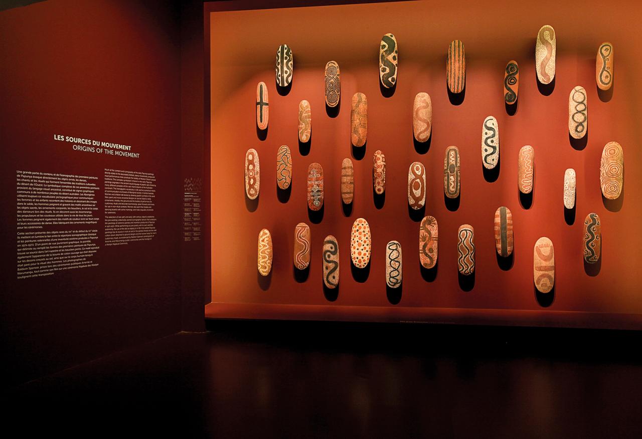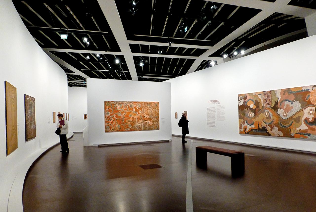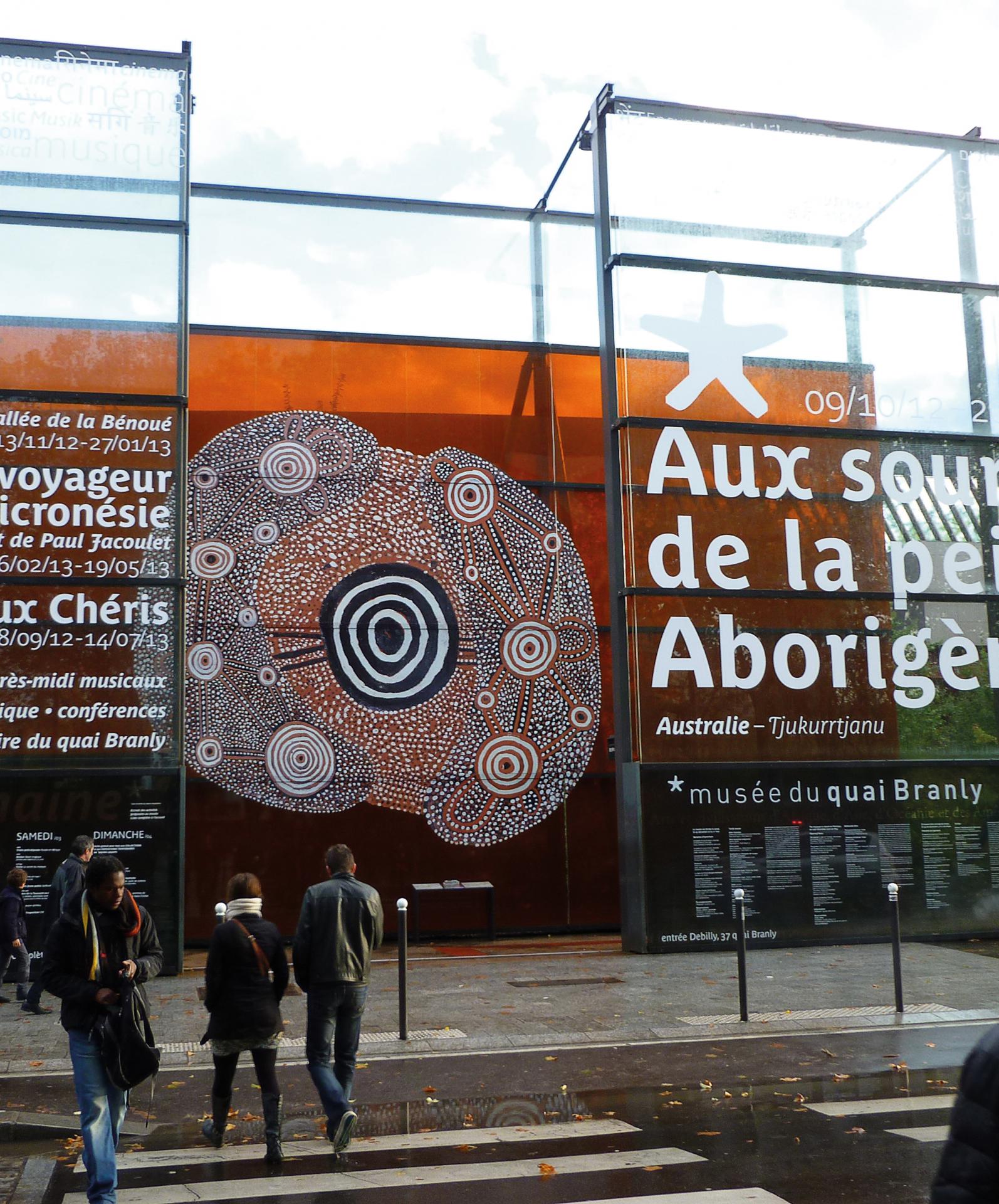 Aux Sources de la peinture Aborigène: Australie Tjukurrtjanu is the fifty-first special exhibition presented at MQB, a museum that differs from the Musée du Louvre and the Musée d’Orsay insofar as a large proportion of its visitors are French. This ‘first major exhibition devoted to Aboriginal Australian art in France’14 See Veronique Mortaigne, ‘La fabuleuse histoire du rêve de la fourmi a miel: Au Quai Branly, première grande exposition consacrée a l’art aborigène: pointillisme hypnotique et cercles sacrés’, Le Monde, 30 Oct. 2012, p. 19. Translation is author’s own. attests to the importance of Australia’s first peoples who have suffered hugely at the hands of colonisers and have chronically been denied their rightful place in history, both in Australia and throughout the world. Moreover, Tjukurrtjanu was chosen by MQB because of the aesthetic power of the Aboriginal painting movement, appreciable in the works incorporated into the very fabric of the architecture of the Musée’s administration block and into its collection.