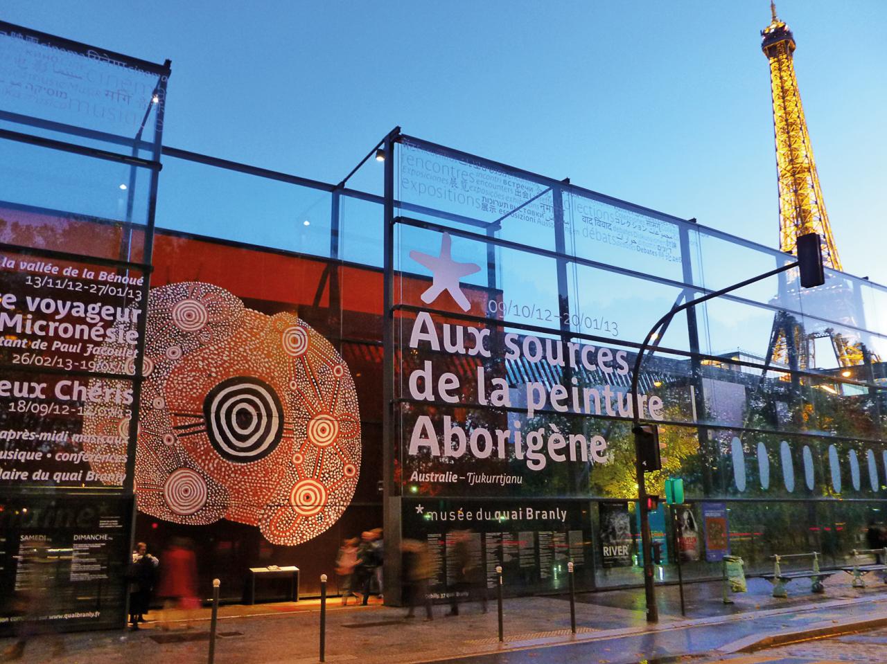 Importantly, MQB arranged for Blin to visit Tjukurrtjanu at The Ian Potter Centre: NGV Australia and immerse himself in all facets of the exhibition. Within the angular geometry of NGV Australia, Blin distilled the essence of the exhibition and sensed the need for its small paintings to float in space and be suffused with light. He was particularly receptive to the rationale of the exhibition and its sequential logic; the geography of the Western Desert; the power, rhythm and tonality of the individual paintings; and the marked difference between works. Blin sensed the need to create a powerful introductory space that would preface the emergence of a brilliant new painting movement. This element of the exhibition, comprising a body of rare painted shields, spear throwers, stone knives, headbands and ephemeral body ornaments, announces the collectively owned, pre-existing iconographic lexicon visible in the rest of the exhibition. Blin photographed all aspects of the Melbourne installation and collected digital images of all works, objects and texts, including artists’ biographies. A continual email dialogue ensued between MQB and myself in which Blin transmitted drafts of the space, and MQB Exhibition Manager Laura Dragici-Foulon clarified labels and supportive texts and submitted designs for the museum’s facade and posters. Blin’s digital designs of the revamped exhibition space were a challenge to decipher and spatially envisage. I was therefore full of anticipation and tremulous excitement as I finally crossed Pont de l’Alma and saw a sign leading to MQB.