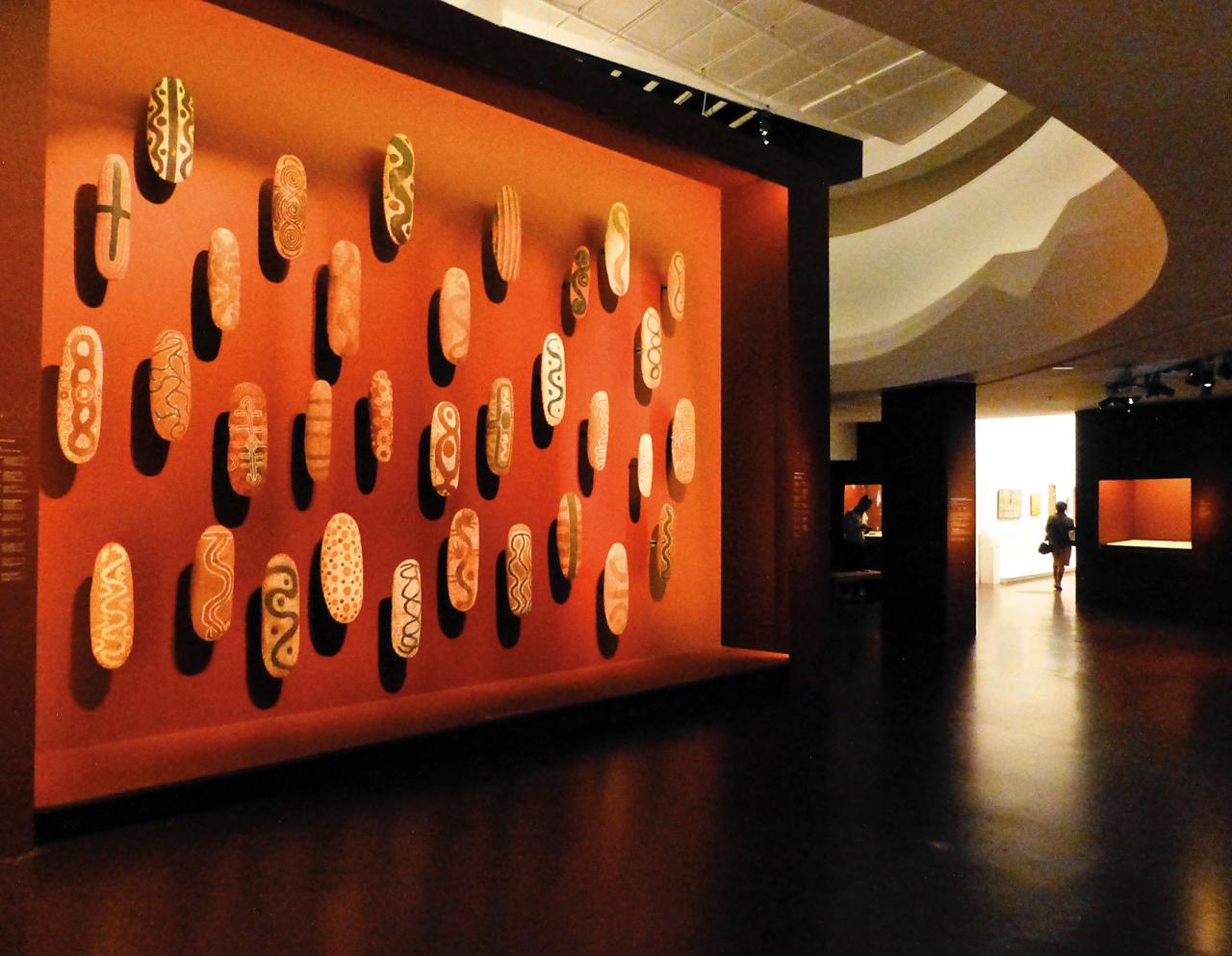 Following the documentary film footage was the Water Dreaming section devoted to the Kalipinpa iconography of Pintupi artists Walter Tjampitjinpa and Johnny Warangkula Tjupurrula (fig. 10). Within this space a dialogue was created with pearl shell pendants collected from the Kimberley coast and then traded inland for use in Water Dreaming ceremonies. The flowing spaces of the exhibition were here subdivided by short feature walls, enabling smaller groups of works to be singled out for special attention, such as Warangkula’s seven most ethereal and complete Water Dreamings, which brought to life the sentient landscape after regenerative rains.