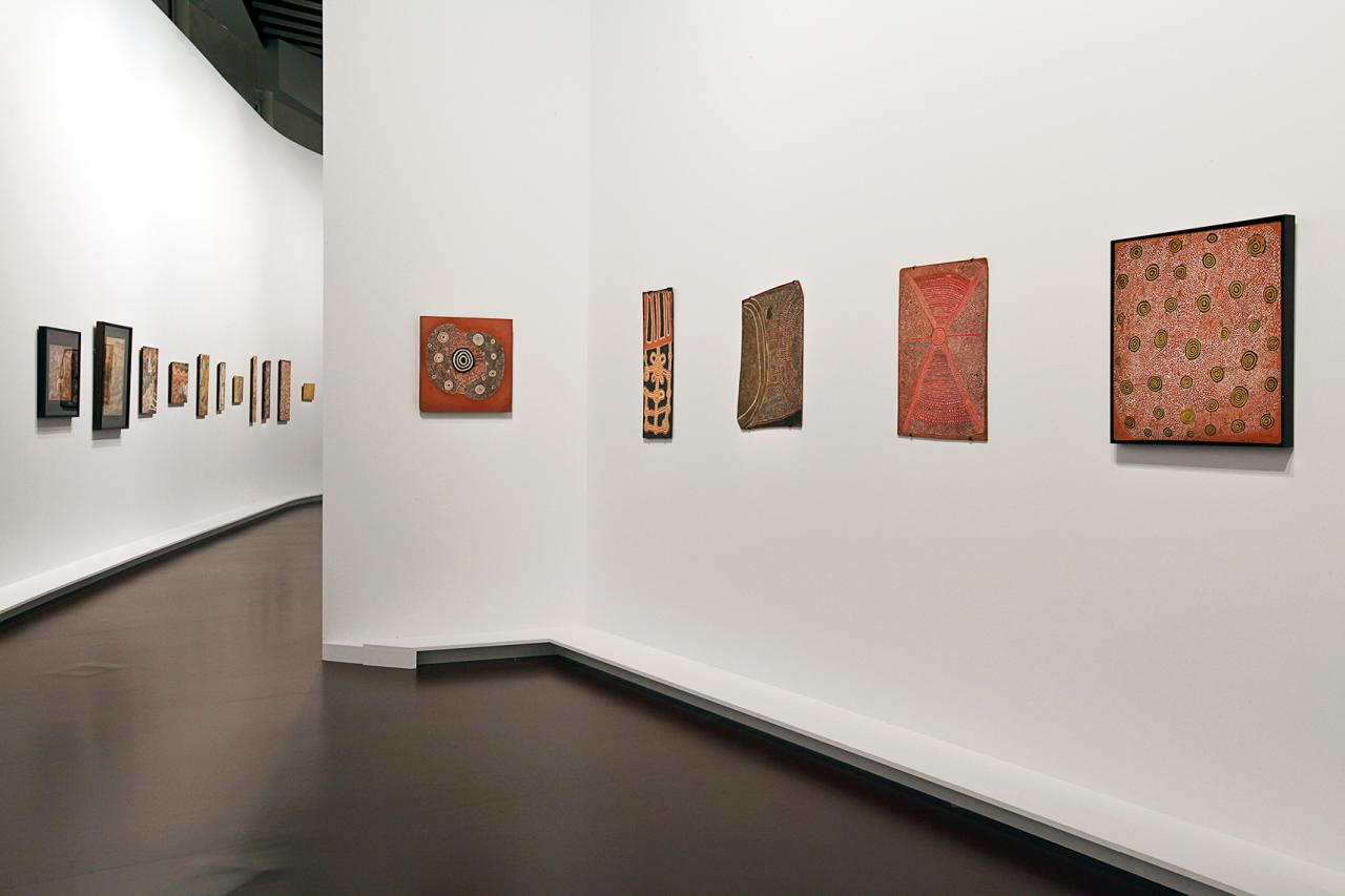 More than two decades later, the NGV toured Tjukurrtjanu to MQB, consolidating and building on the interest demonstrated by Paris audiences in the exotic spectacle of these two specially commissioned ground paintings. Tjukurrtjanu examined the modern painting practice that originated at Papunya, conceived from men’s unseen ritual designs. The selection of 200 early paintings presented a comprehensive survey of twenty of the major artists who were instrumental in the movement’s genesis and eventual efflorescence. These paintings of extreme gravitas and invention were contextualised by an introductory display of decorated ceremonial objects that established their pre-existing, collectively owned iconographic lexicon.