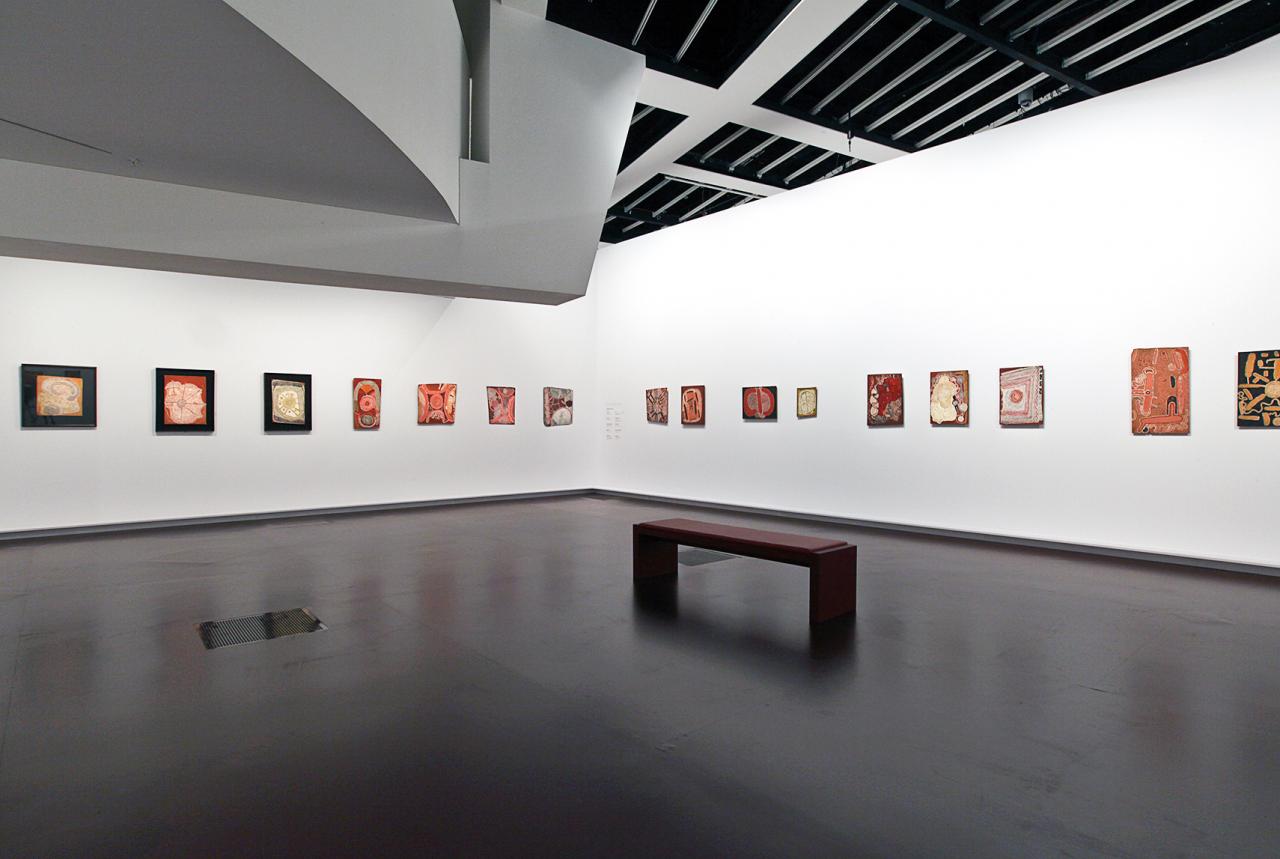 A spacious, square, restricted room with a high veiled ceiling was positioned at the heart of the MQB exhibition, preceded by a narrow section for viewers to access the accompanying publication and the NGV’s Tjukurrtjanu internet microsite. This simple space, which was large enough to enable a linear hang by artist, created a pause for contemplation, enabling the ritual objects viewed at the show’s entrance and overtly depicted in the works to resonate in the mind of the viewer.
