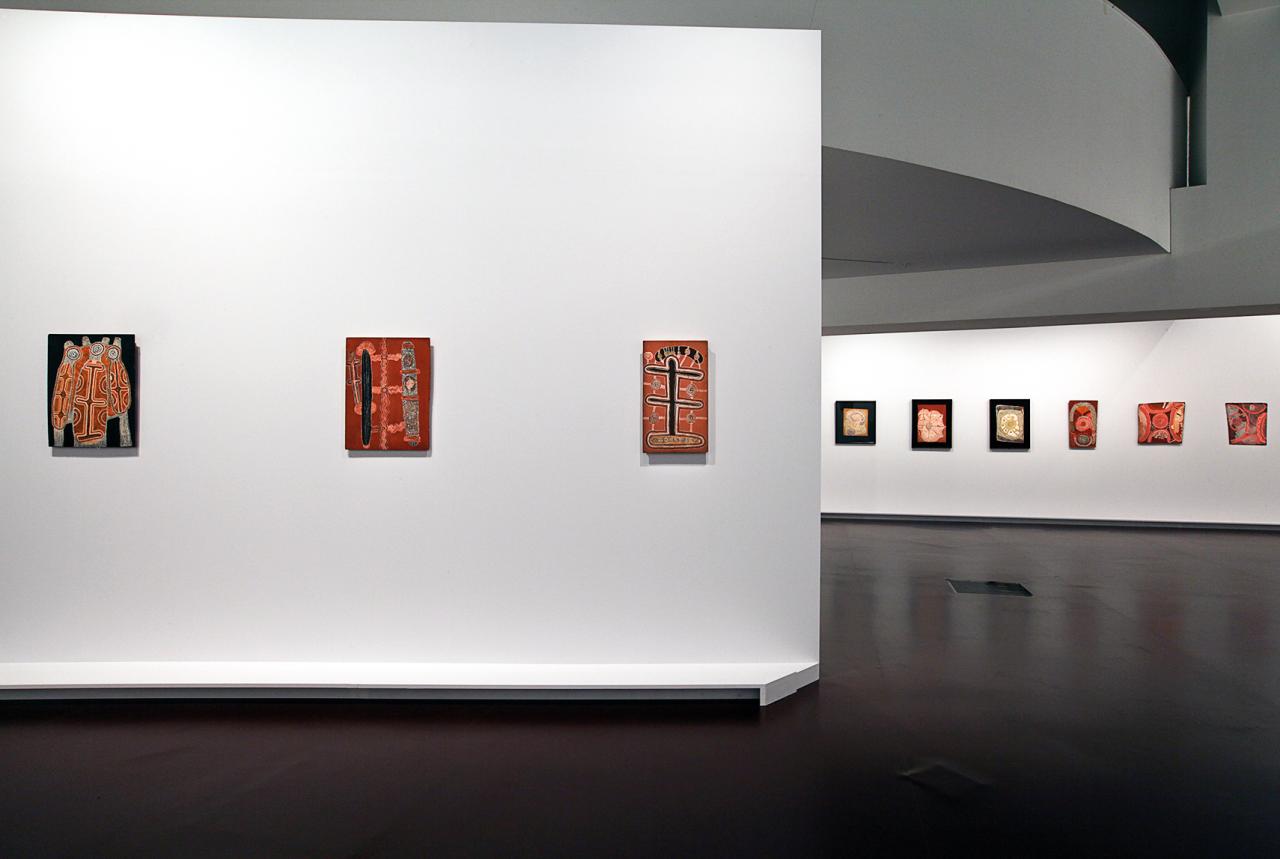The spare and austere spaces of Blin’s simple, bi-chrome exhibition design enabled works by individual artists – signalled by biographies but appropriately grouped in sections – to breathe and have primacy. Some walls were visible as the viewer ascended a ramp into the permanent collection galleries, affording a planar perspective on a selection of large canvases, shields and early paintings from Aux Sources de la peinture Aborigène: Australie Tjukurrtjanu. Such glimpses served to whet the public’s appetite prior to the opening of the show. The exhibition space, incorporating graceful curved walls and a ceiling of varying heights and exposed inner structure, offered intimate and long-range sightlines. Even the colour of the floor was designed to accord with the dominant palette of Western Desert landscape and Papunya Tula painting. Walls were protected by shallow plinths that prevented viewers from touching the delicate surfaces of the works; an architectural detail which had a gratuitous benefit of framing the shields and the paintings.