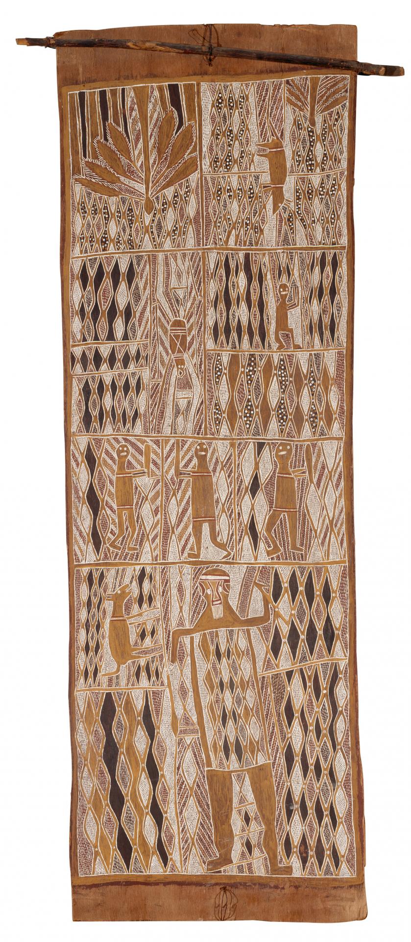 In focusing on bark painting, the exhibition acknowledges two strategic events instrumental in the evolution of contemporary forms of Aboriginal art and in advancing Aboriginal claims for native title. Firstly, I am reminded of Baldwin Spencer’s encounter with Kunwinjku and Gagadju people in Western Arnhem Land in 1912. As then Chief Protector of Aborigines in the Northern Territory, Spencer, a Melbourne-based anthropologist and art collector, had observed iconic paintings on wet season bark shelters, as well as on Arnhem Land Escarpment. In commissioning Kunwinjku and Gagadju artists to create images on bark similar to those he had seen, in exchange for sticks of tobacco, Spencer communicated his interest in their art and culture and helped stimulate the production of paintings on single sheets of bark. A sophisticated art form evolved from this commission and the subsequent encouragement of art production from anthropologists and missionaries working at Oenpelli, Milingimbi, Yirrkala and Croker Island, where different regional styles developed and continue to change.