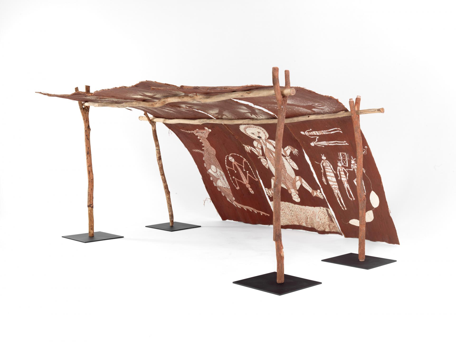 One object in the NGV collection sheds light on this important transformational moment, and is therefore central to the new exhibition. Bark shelter, 1987 (below), by Wamod Namok and Dick Ngulaynuglay Murrumurru, memorialises the wet season dwellings customarily made and decorated with ochre paintings in Western Arnhem Land and along the east coast of Australia. This work, commissioned by Czech rock art specialist George Chaloupka, is displayed on metal supports inserted into the ironbark flooring of the second gallery, without any intrusive platform, thereby enabling visitors to engage with its ephemeral structure and, by studying the intuitive drawings on its surface, understand the origins of the bark tradition. The presence of the artists’ signature handprints alludes to rock art; a reference accentuated by the positioning of the shelter amidst bark paintings by Kunwinjku artists inspired by images of ancestral spirits and animals found on the rock faces of the Arnhem Land Escarpment.